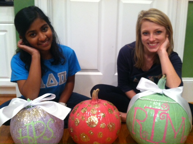 The pumpkins are finished, and I have to say that I’m very pleased with the designs. Harita and I had a fun night monogramming, glittering, and adding bows to our pumpkins. Here are the results!