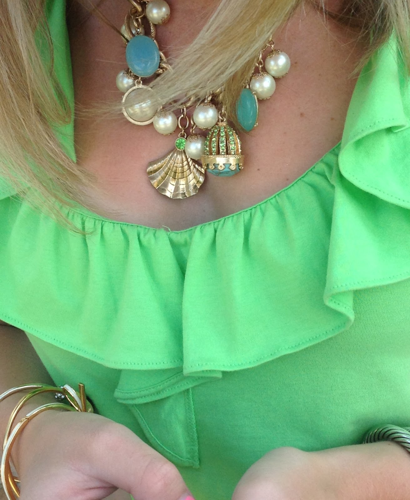 Have I ever mentioned how much I love sea shells? I’m sure I have! That is why this necklace from Pink Pineapple Shop falls into my “Notable Necklace” category. Not only am I crazy about the sea shells on it, but I am also loving the pearls (another favorite), green and turquoise scattered throughout the necklace. It makes for the perfect summer piece as you will find it matching so many summery styles, Lilly being one of them!