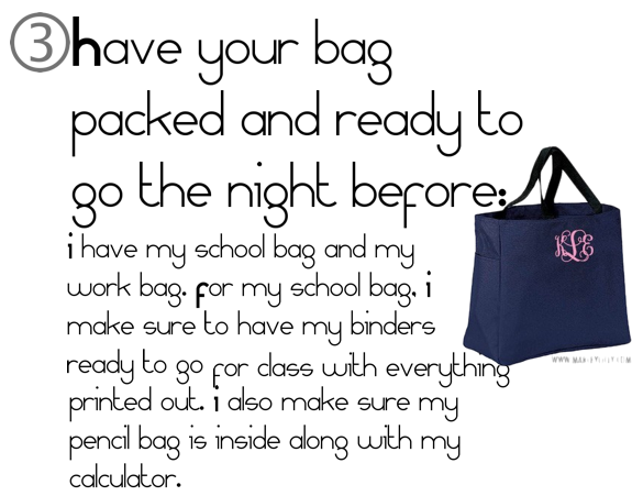 The mornings are rough…I’m not at all a morning person, but that’s life. Morning classes are a pain, but I prefer them over afternoon/night classes. After class, I go to work, so if I were to take afternoon classes, I’d go to work in the morning. Getting out the door in the morning is part of life, so you must have a game plan!