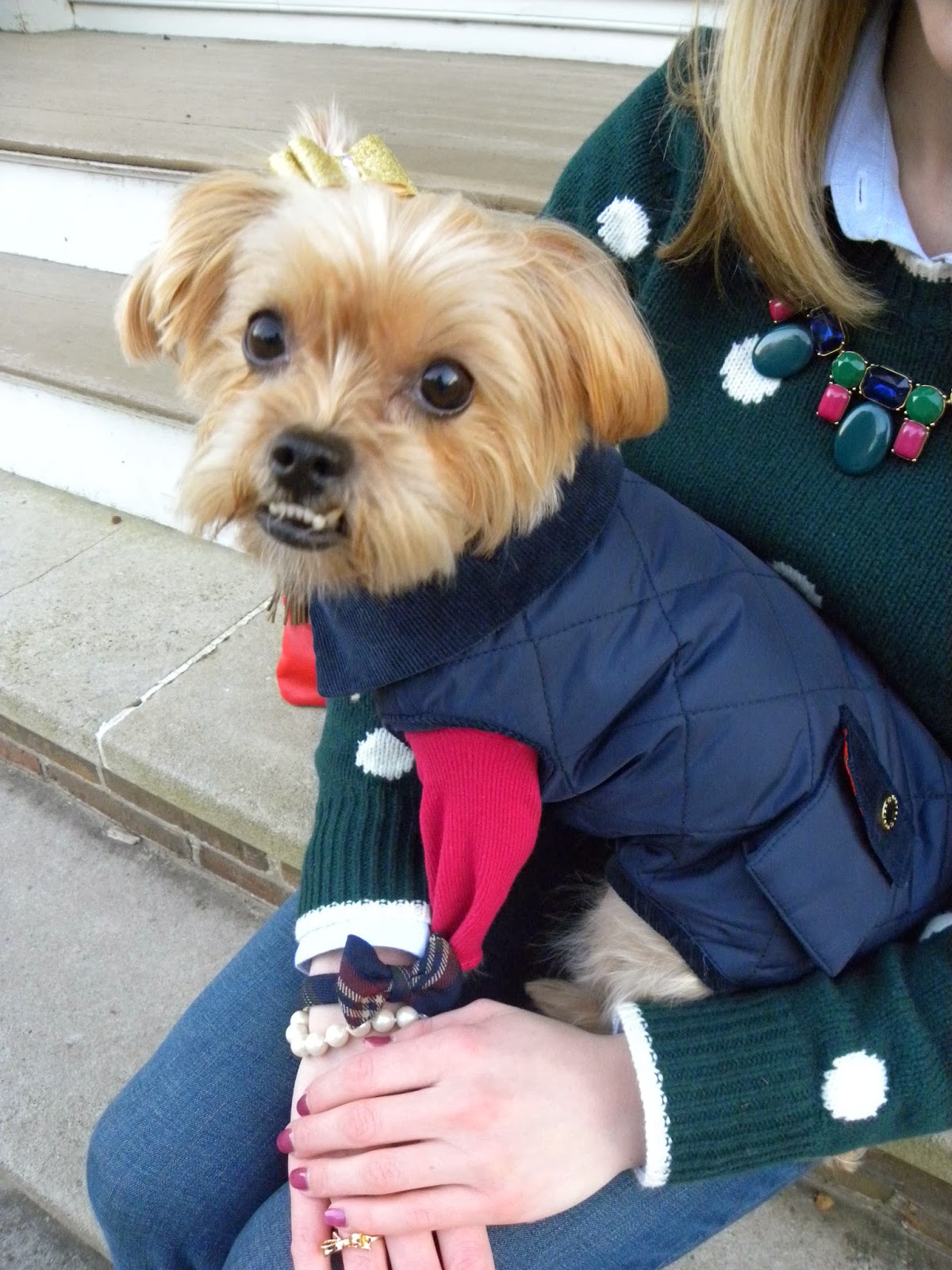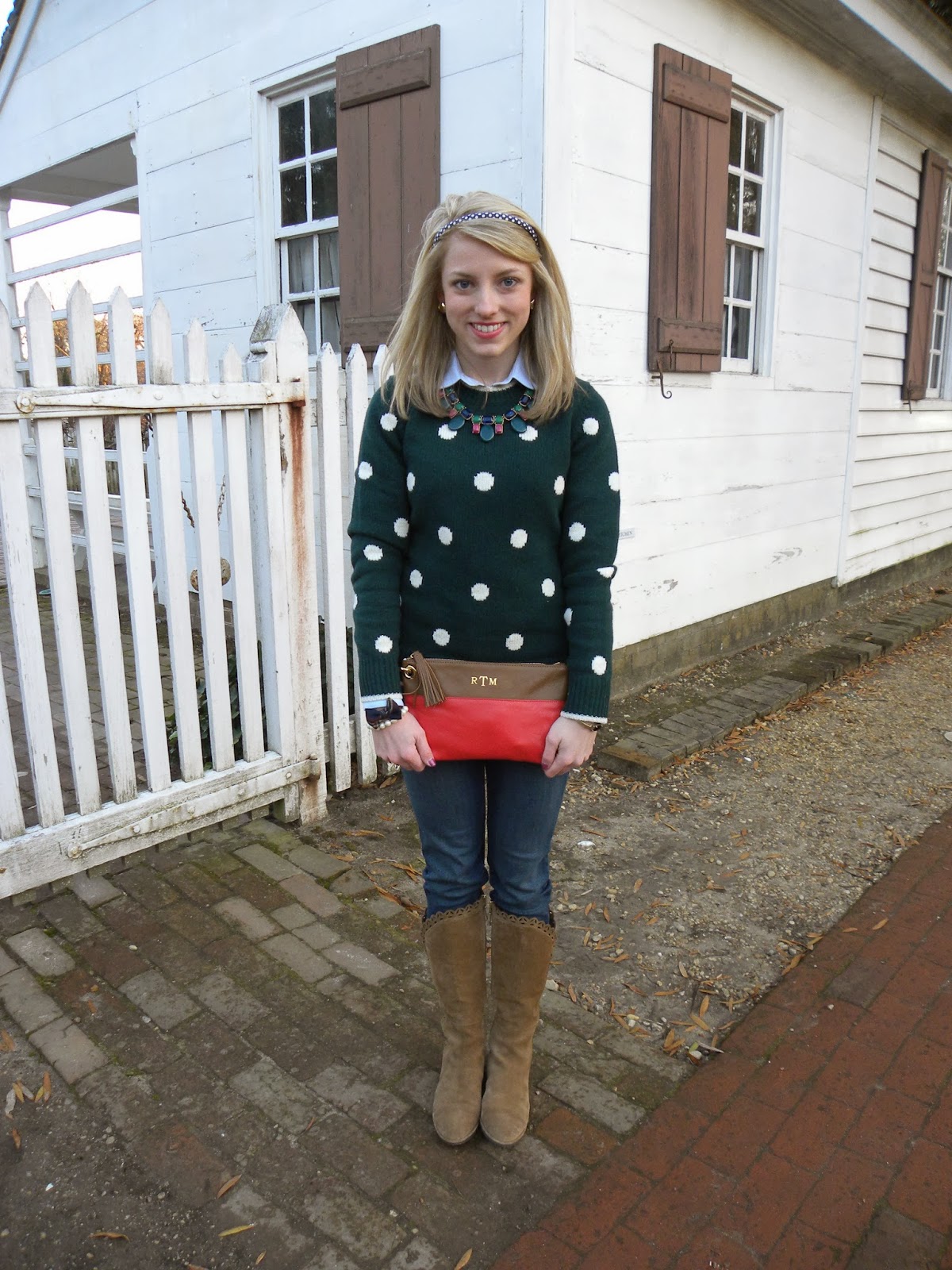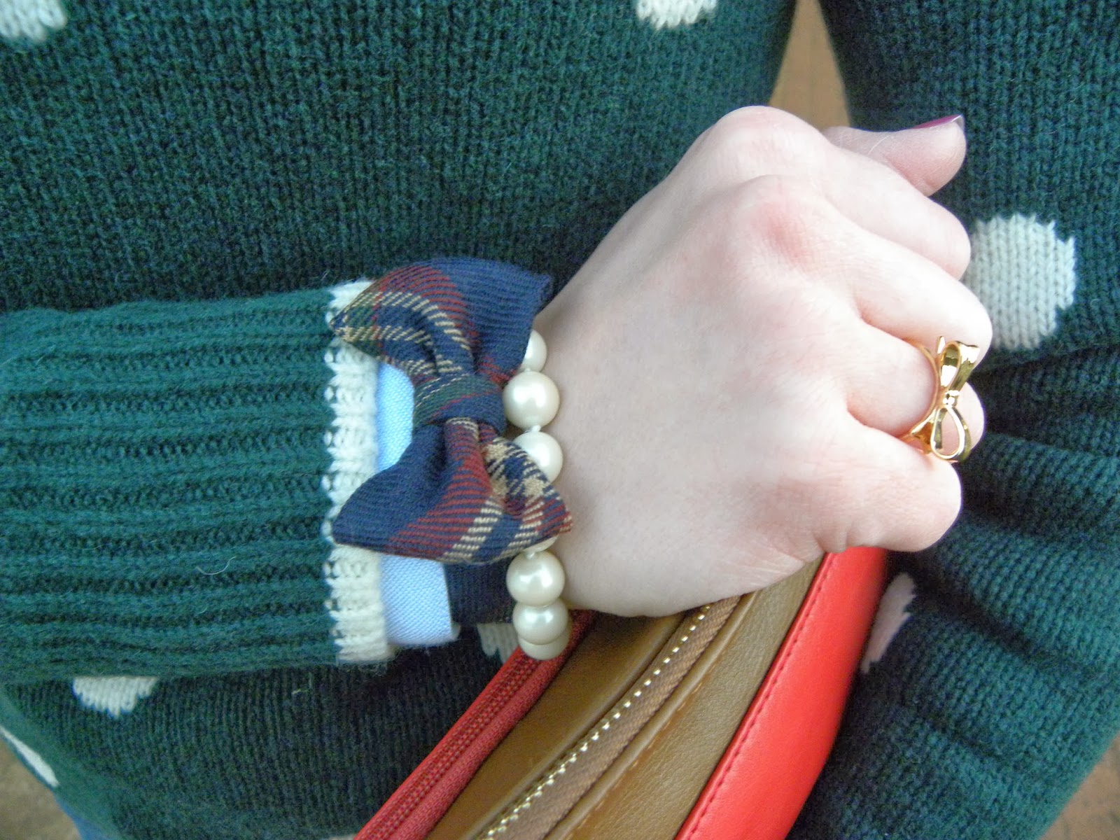 I love this outfit! I love your polka dot sweater with your plaid bow and the clutch is fabulous. Very Christmas-y!