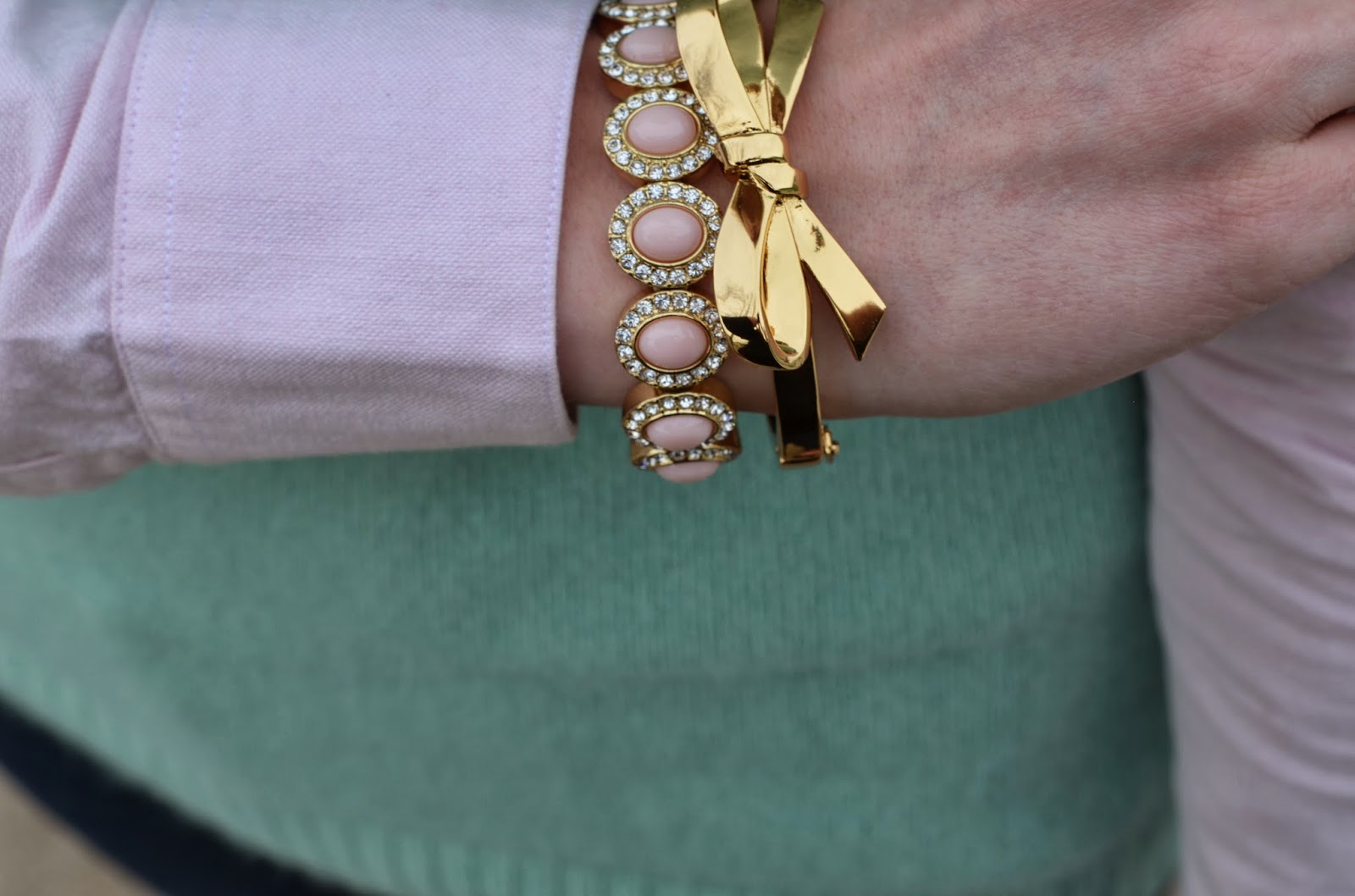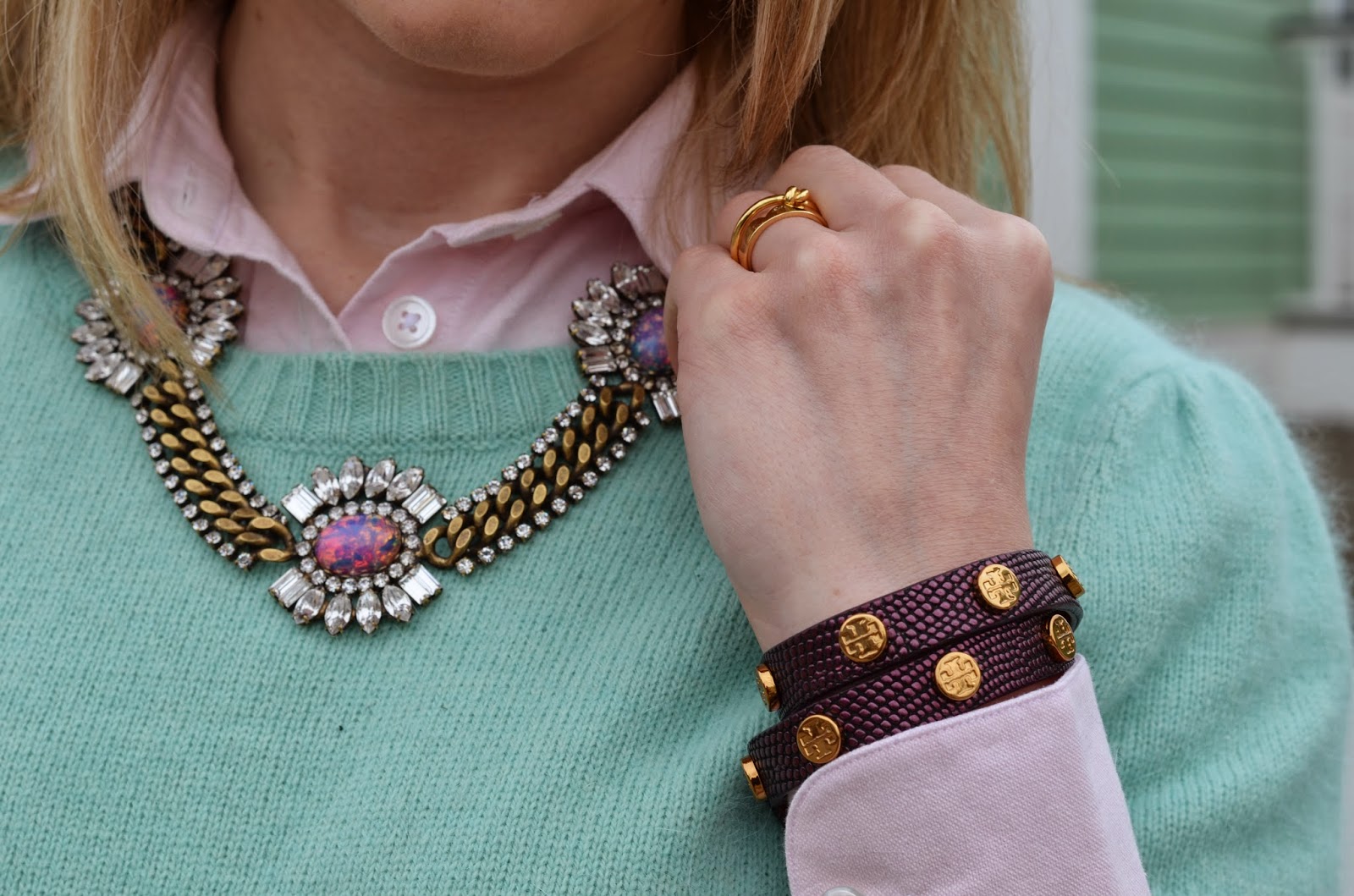 Love how you brought some bright colors into winter! The shirt-sweater-necklace combination is beautiful! I finally shot an outfit yesterday with my green scalloped oxford 🙂