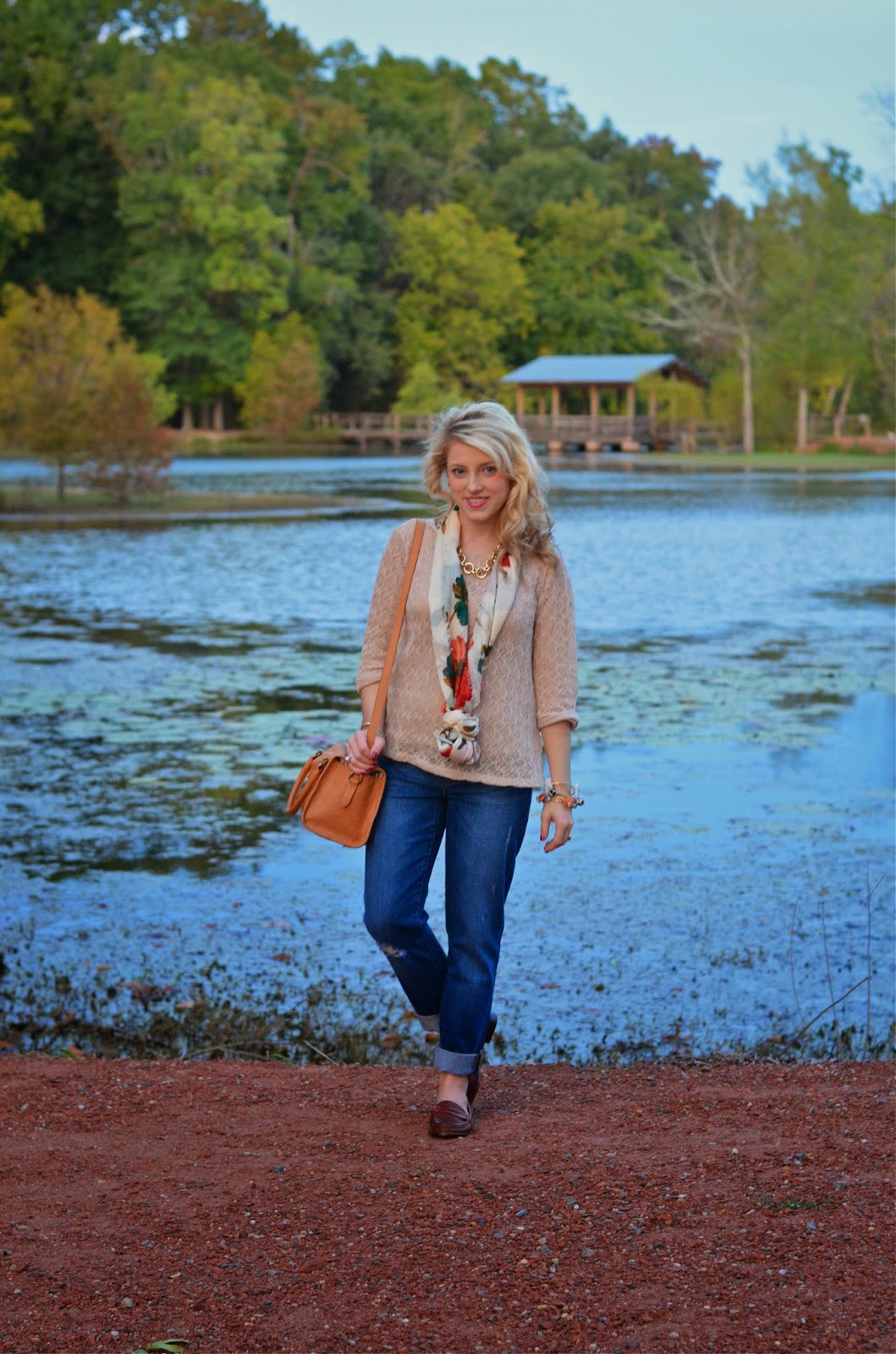 Sweater: Forever 21, Boyfriend Jeans: C.Wonder, Loafers: Frye Company, Scarf: Old Navy, Bag: Madewell (old), Necklace: J.Crew Factory, Bracelets: Lulu & LaRue