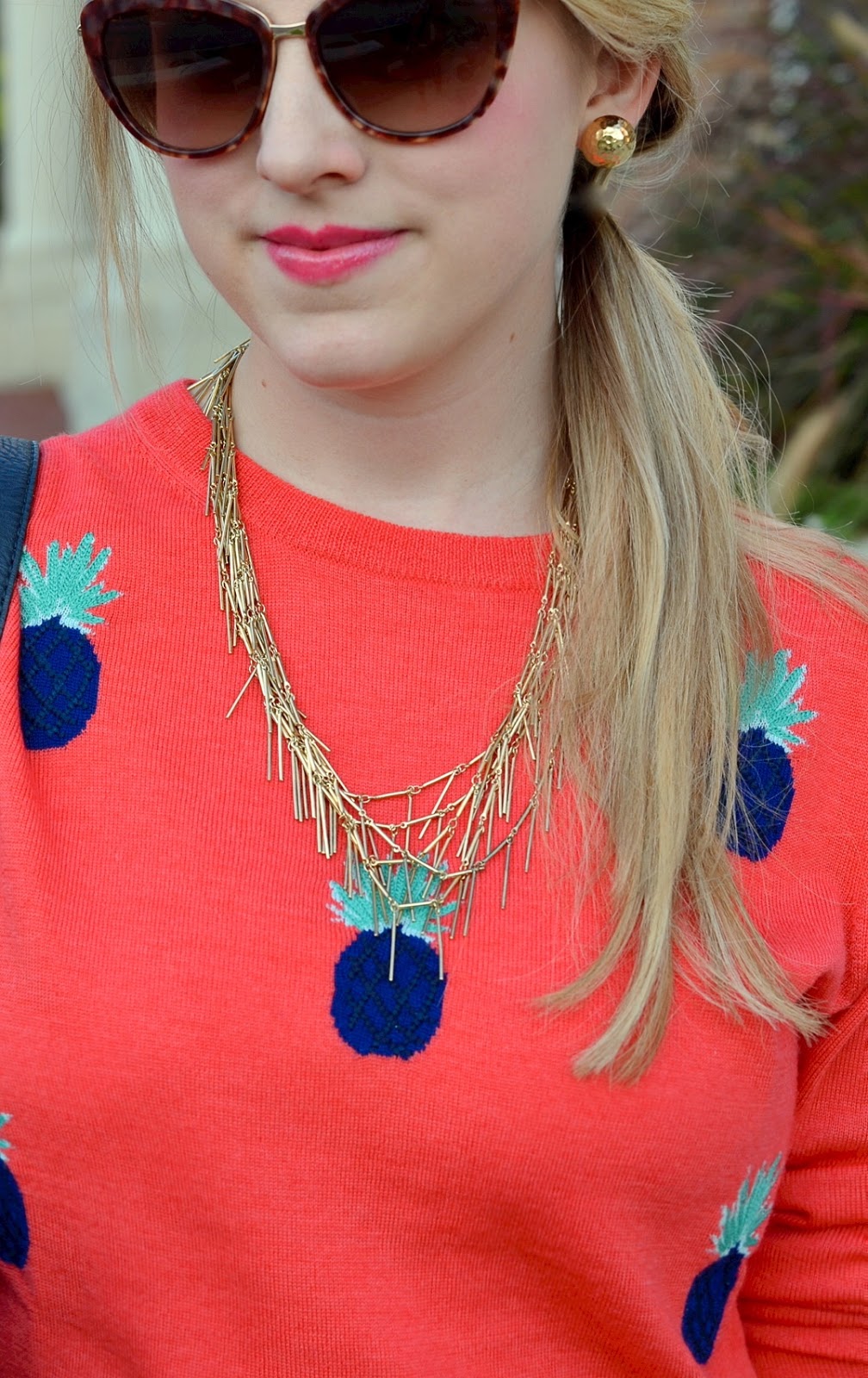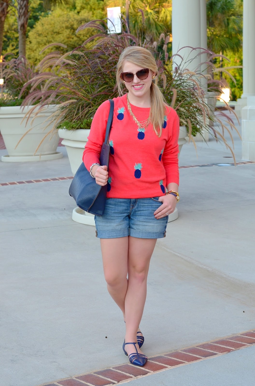 I love love love a good pineapple print! This pineapple sweater from Vineyard Vines is the definition of perfection. The temperatures are still warm, but the humidity was been way down this week (making it feel cooler), so I decided to break it out and wear it. I can’t wait to pair it with denim and layer it with a oxford shirt once the weather gets cool. I’m starting to get fall fever! I think it’s mainly because I am just so sick and tired of the heat. It’s been too hot to take Madeline on walks, so I look forward to picking that up again.