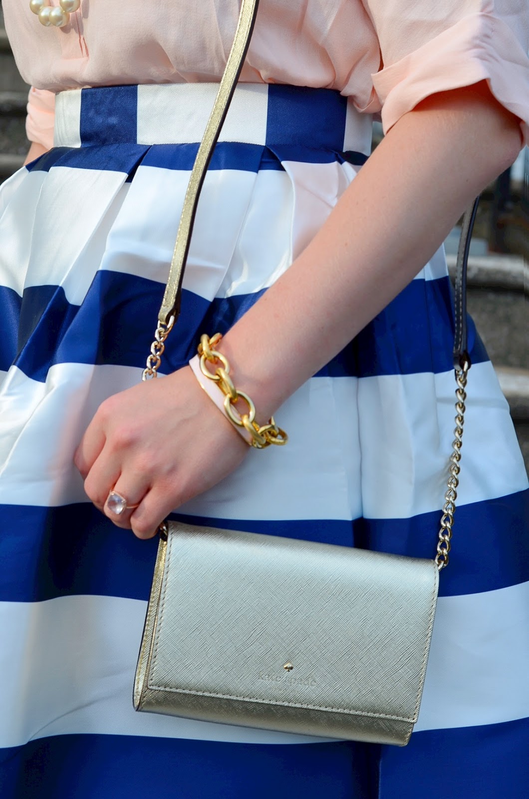 I must admit that I would never have thought to have paired a plain blush pink t-shirt with a fancy blue and white striped skirt. However, this looks absolutely fantastic! Goodness, you certainly have vision!! Love this blog and feel the need to sign in regularly to ensure I don't miss a single outfit! :):)