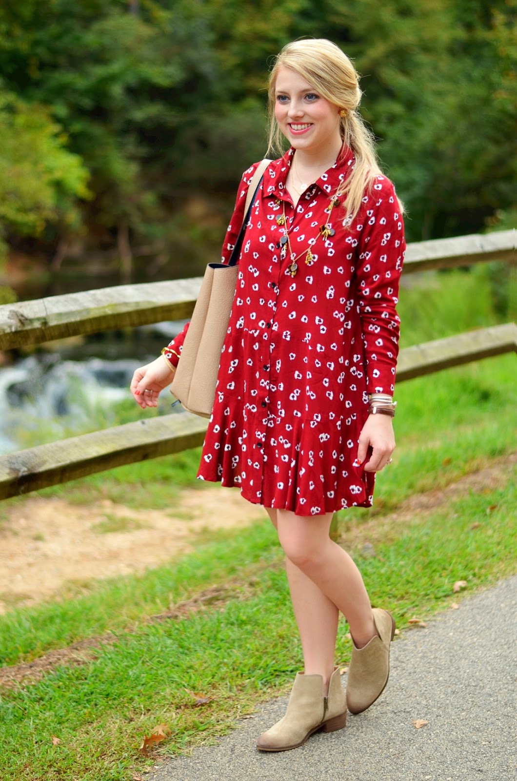 Happy first day of fall, y’all!  Although it’s still on the warmer side here, at least we can say it’s officially fall.  I picked up this tunic dress over the weekend and LOVE it!  I’m short enough to be able to wear it as a dress, although I love the way it looks paired with jeggings as well.  I am so excited to break out my booties.  I’m obsessed with this pair I’m wearing here and the distressed look on the toes.  And this tortoise shell necklace goes with just about everything.  I love the other version of this necklace here.