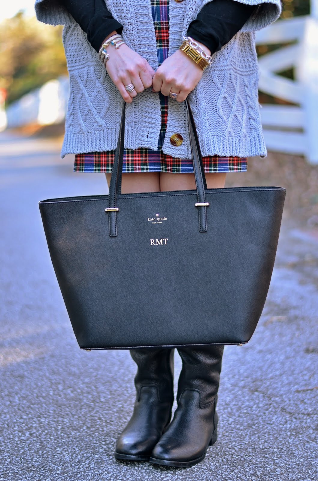 Cardigan C/O (similar) // Skirt // Shirt // Boots // Bag // Bracelets (Tory Burch Fitbit Bracelet / David Yurman)