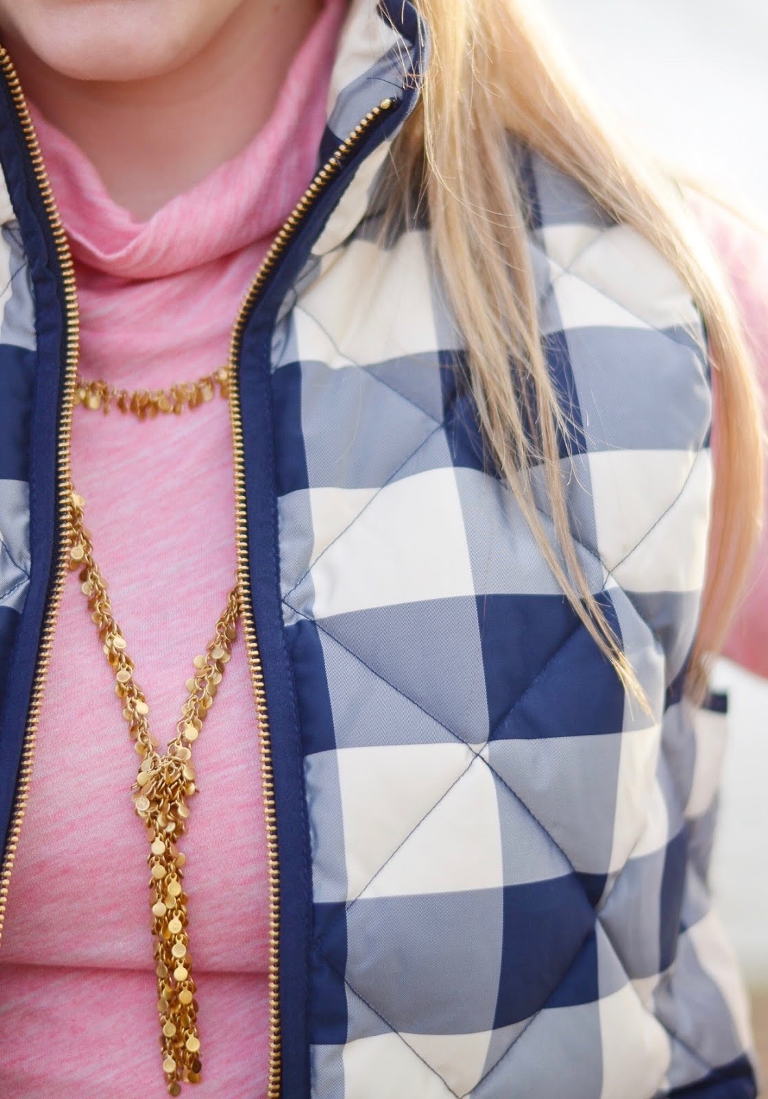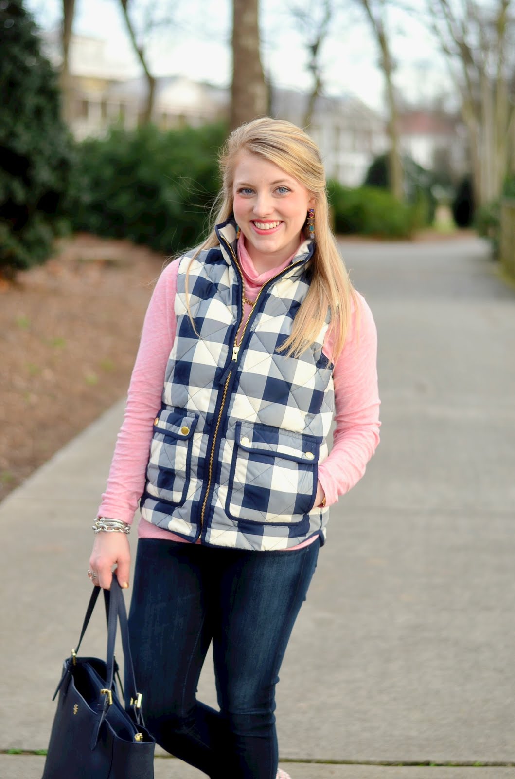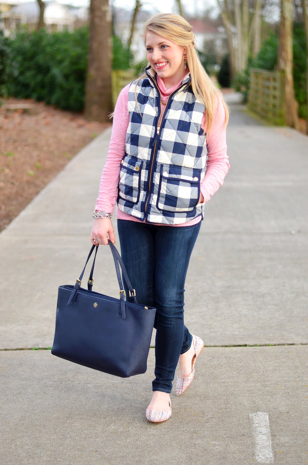 Here’s to the first outfit post for 2016! I have always been very much into J.Crew Excursions Vests, but this one takes the cake as probably being my all time favorite. Not only is it buffalo checked, but it also has the nicest feel to it! It’s a bit heavier than the other vests, but it has a steady feel to it…I love it! Oh, and did I mention it’s currently 40% off the sale price (making it only $65!!)? Pink + navy will forever be my favorite color combination. Also, how darling are these tweed flats?! My best friend, Jaclyn, gave them to me (along with the cute bracelet I’m wearing here) for Christmas. She said they were very “Something Delightful,” and I have to agree 🙂