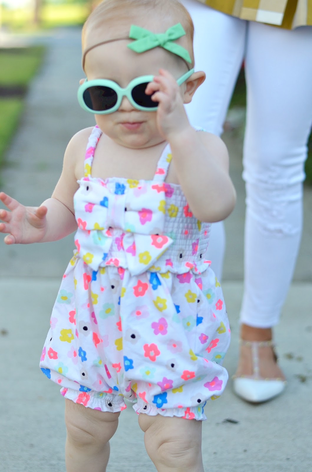 Also, since Madeline is walking now, the second I put her down, she does not want to hold my hand! She is little miss independent. It is crazy how much she knows and how much she has picked up just from watching me. She finds her sunglasses being hilarious and always wants to put them on when she sees me wearing a pair. She never fails to put a smile on my face. Her little personality is the cutest thing! Also, I am also obsessing over the baby Kate Spade pieces out right now. This little bow romper is the cutest. I love the big bow detail and also how soft and easy it is…perfect for babies constantly on the go!
