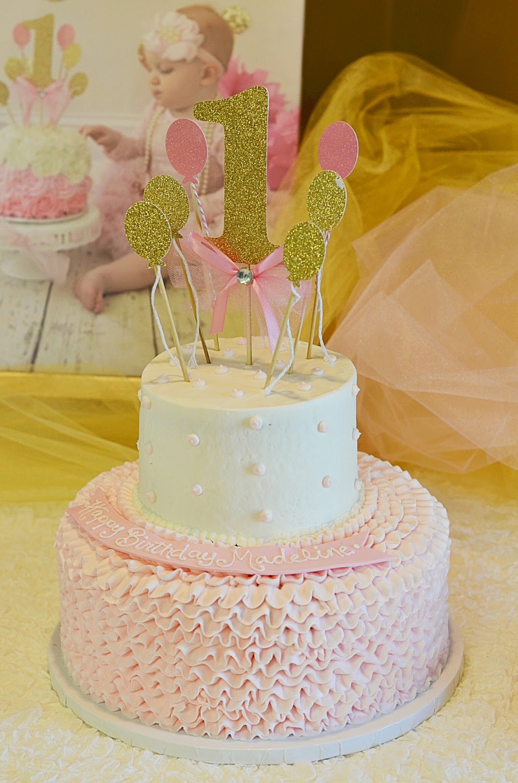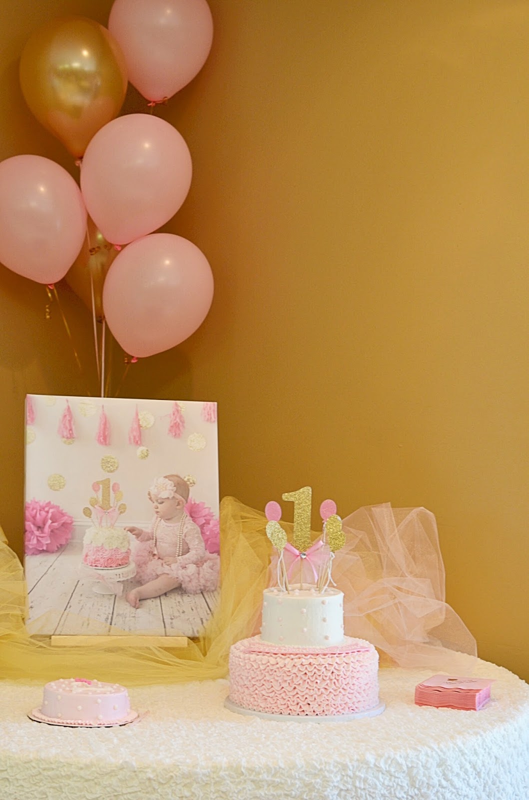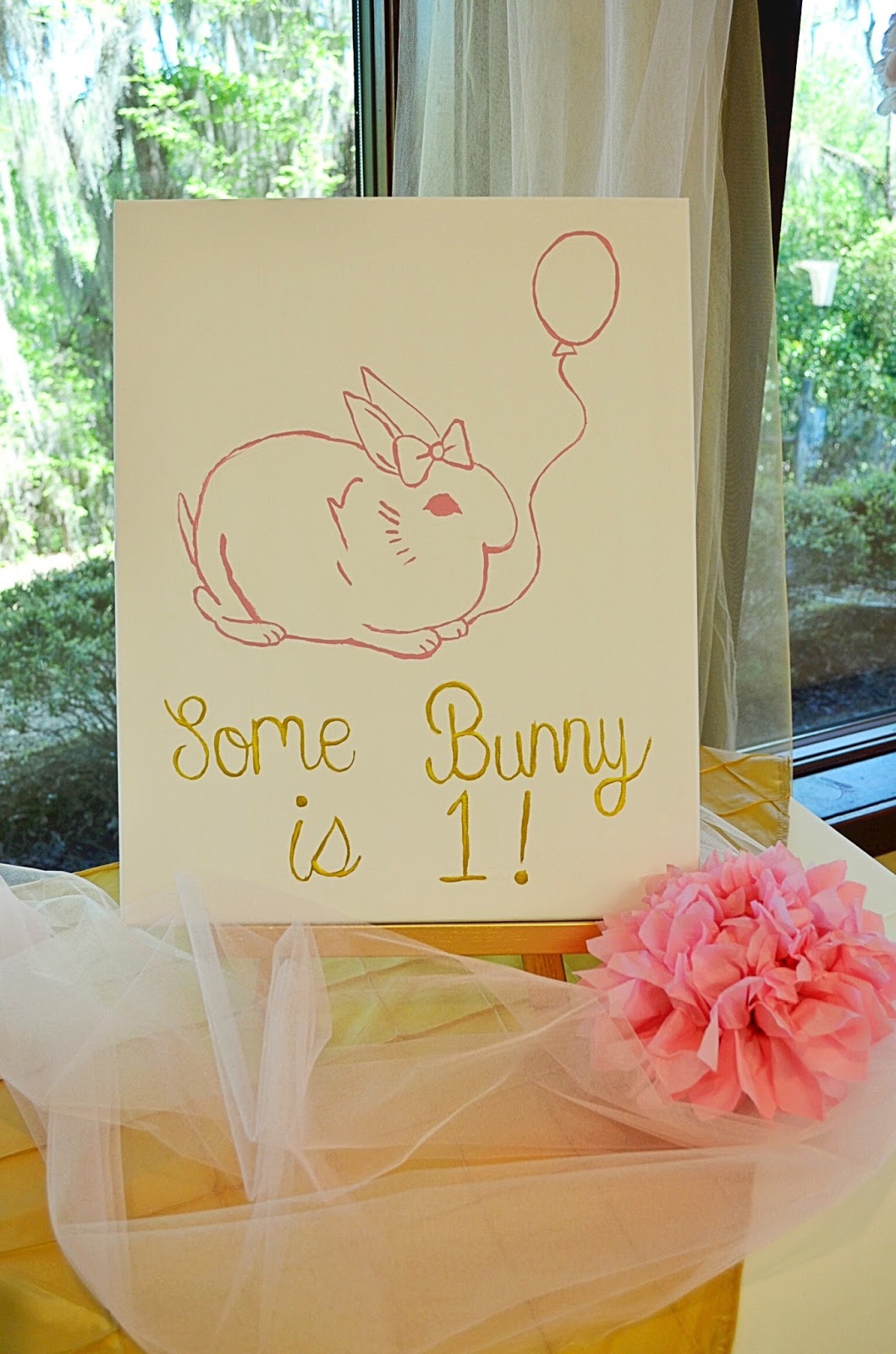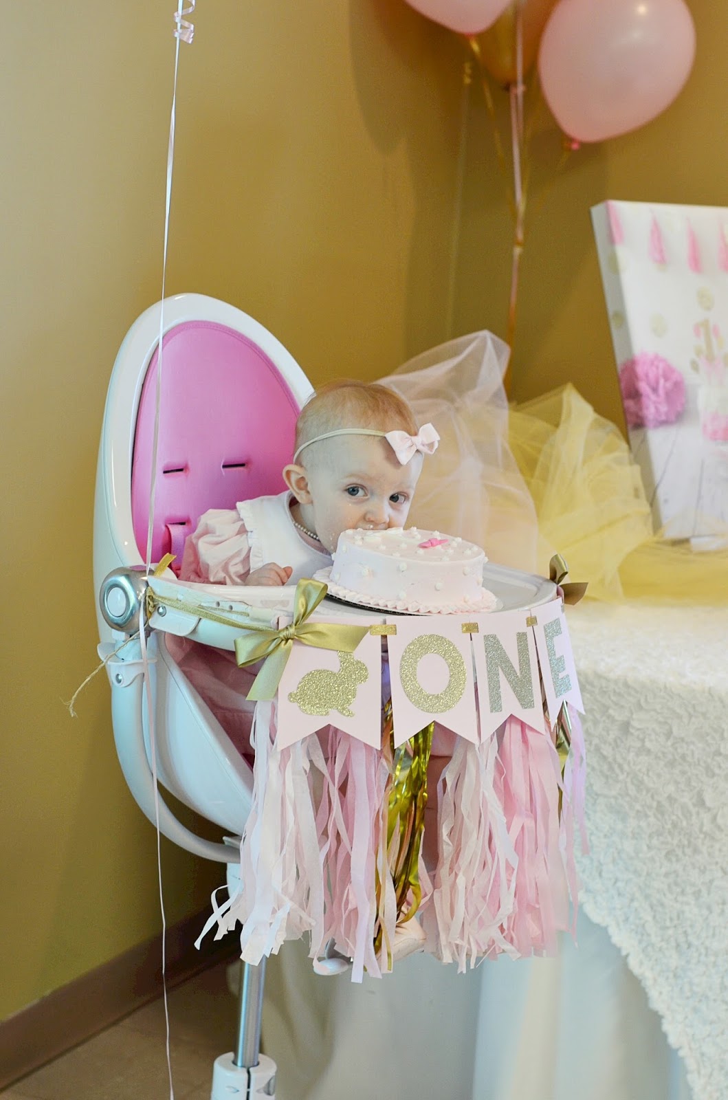 Hello Friends! I’m so excited to be sharing a sneak peak into Madeline’s birthday party from this past weekend. I was able to snap a few pictures of the decorations and set-up before the party began, and my sister made sure we got a great shot of Madeline (literally) digging into her smash cake. I knew all along that I wanted to keep the colors of her party pink and gold. Not only do I have a deep love for pink and gold, but it has also been a color theme I’ve carried throughout this past year with her. With her birthday being so close to Easter, I thought it would be perfect to do a “Some Bunny Is One” party. And I quickly learned that there are a ton of pink and gold + some bunny is one decorations out there! Etsy was my best friend with most of the party planing. I’ve provided direct links to pretty much all of my decorations above. The adorable “some bunny is one” canvas was painted especially for Madeline by Jaclyn! I was also so excited that we were able to use the tulle table skirt from my baby shower! That was so special.
