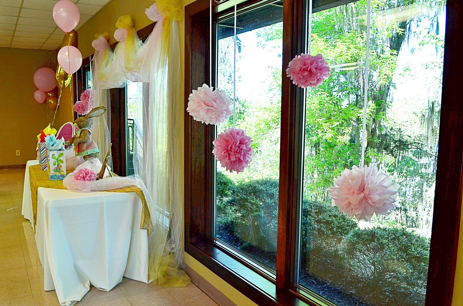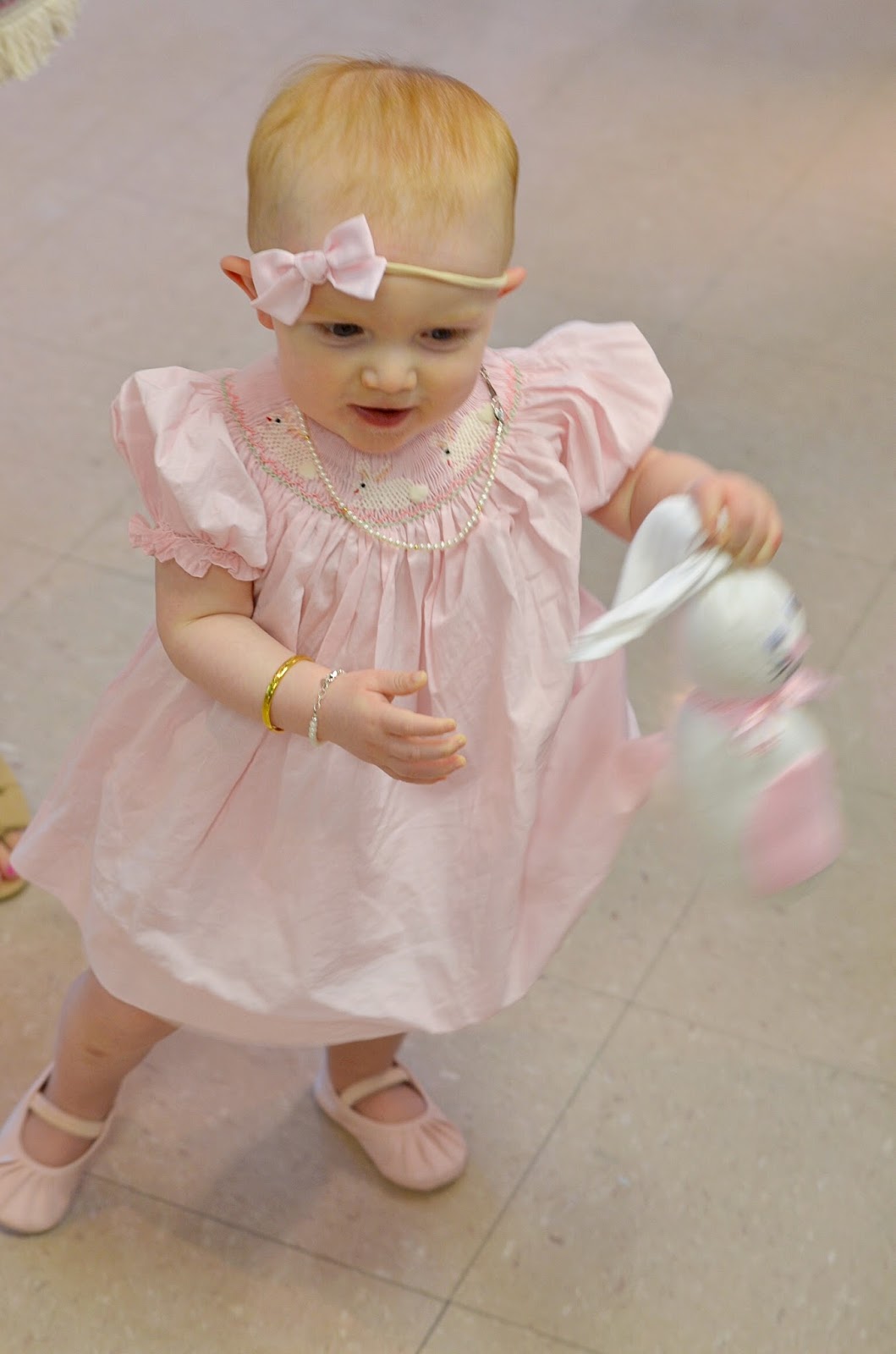 I used two fabulous local bakeries to create her birthday cake, smash cake, and the cookies for guests to take home. I also had a little station where the children could fill up boxes with Annie’s Bunny crackers to take home. The little boxes were decorated with pom-poms for the nose and tail and a bunny face, thanks to my Mama because I can not draw! Since some of the children that came to the party were a little older, I thought it would be a fun activity to make sock bunnies (Thanks Mrs. Heidi for helping with these)! Have y’all seen this tutorial on Pinterest?  The original tutorial calls for rice to stuff the bunnies with, but since the venue I rented prohibits rice, we used teddy bear stuffing. These were definitely a hit with the kids! I wish I had snapped a better photo of them. Madeline carried one around most of the party.