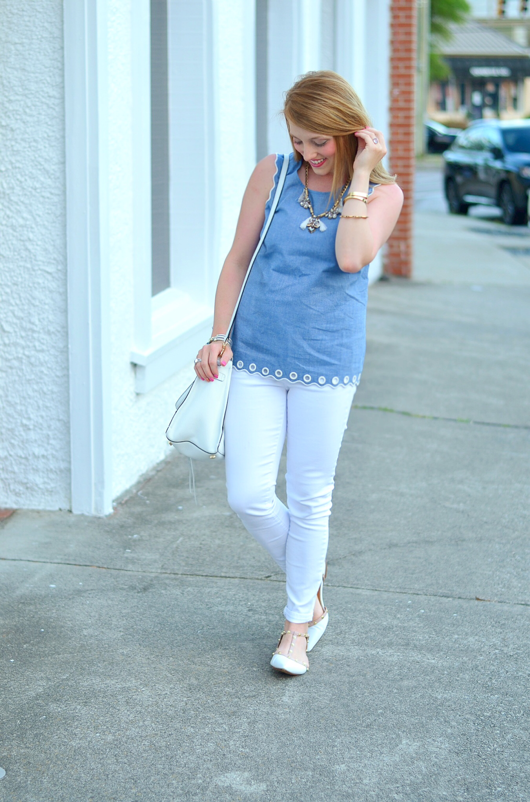 Happy Friday, Friends! Here’s a top that is my definition of spring! I love a scallop detailed piece all year round, but for some reason, I think that scallops are even more fitting for spring. They remind me of tulips! But I also think it is a good idea to have a few chambray tops in your closet. They are the perfect go-to and allow you to create an effortless look. They are especially great for creating a look that appears that you put a lot of thought into when you really just didn’t feel like putting too much into it, know what I mean? So, what I’m trying to say is that this chambray + scalloped top is perfection! It’s current’y 30% off right now with the code “TIMETOSHOP”.