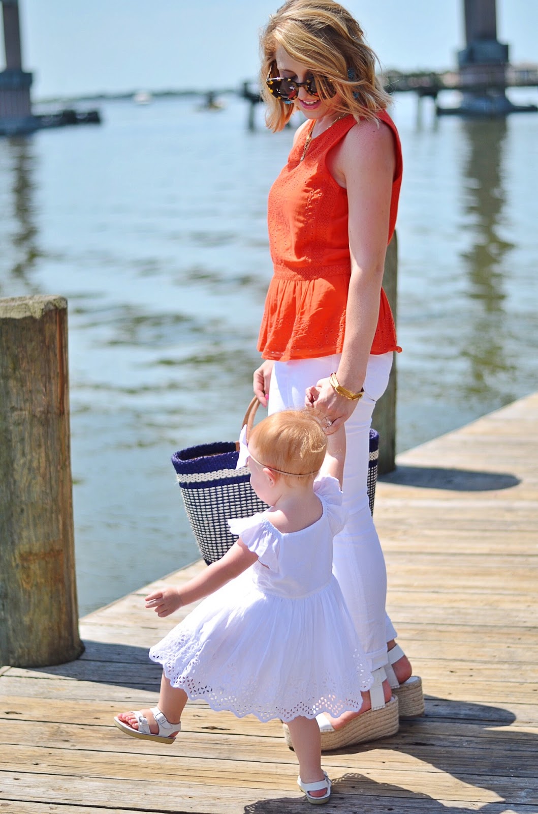 Here’s an outfit I wore this past week at the beach. Persimmon & turquoise are two colors that I think compliment each other so well. Whenever I wear an orange-ish color, I always want to add in a pop of turquoise. I absolutely love these statement earrings! And this eyelet peplum is also a favorite of mine…I have it in white too! And I love this little eyelet dress Madeline is wearing. Also, she wanted so badly to jump in the water when we were taking these pictures. 😊
