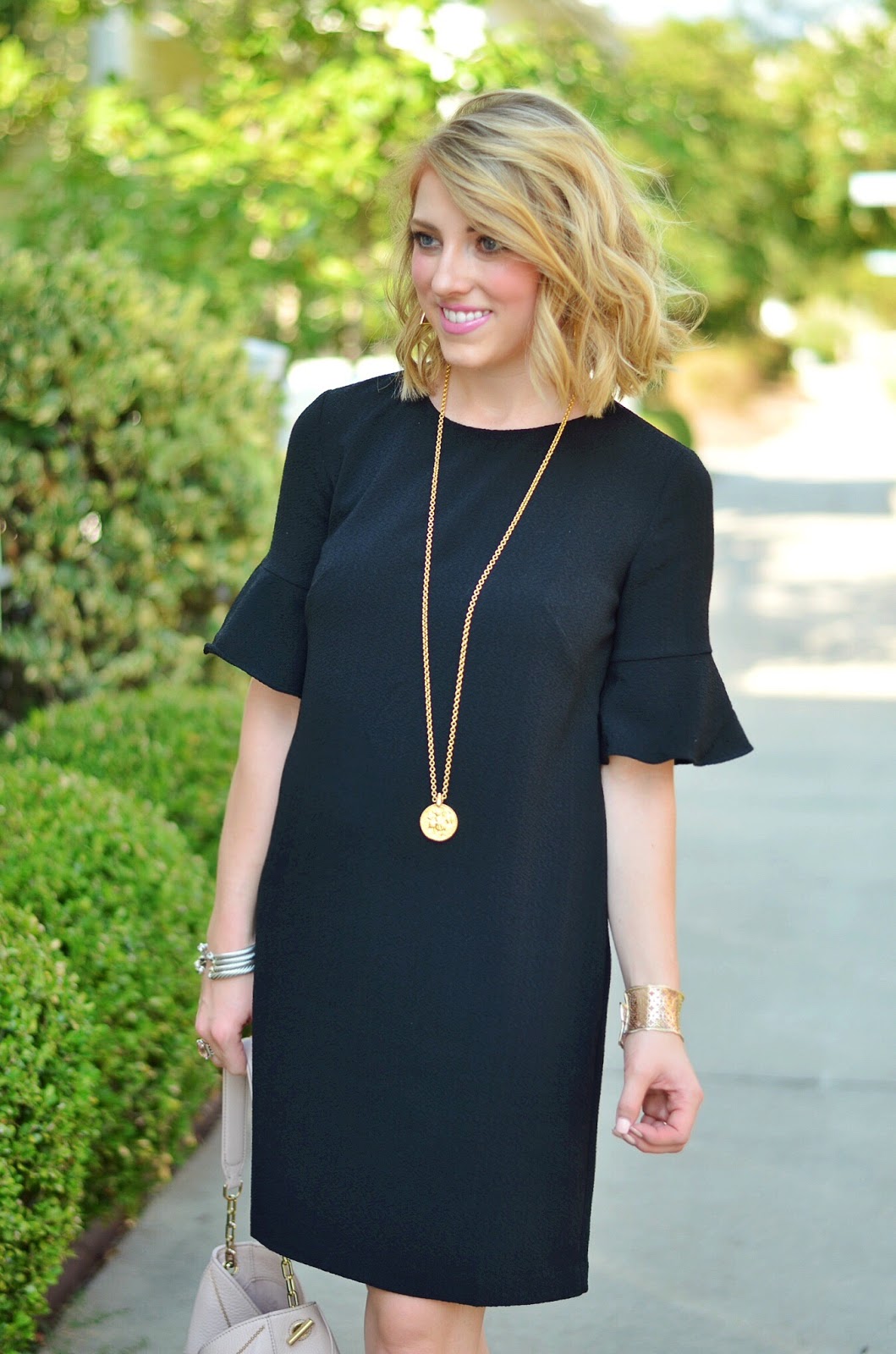 Happy Monday! I purchased a LBD (little black dress) about this time last year and goodness did I get some wear out of that thing! I like to style pieces on here that I get a lot of wear out of and pieces that are just a “good investment”, if you will. A few weeks ago for my best friend’s bachelorette weekend, I needed a black dress. Mine from last year wasn’t fitting the best since I’ve lost a good bit of weight since then, so in a time crunch, I ran over to Loft to see if they had one. My friend Kelsey who works there showed me this perfect LBD that I couldn’t be more obsessed with! I love the style, and the bell sleeves are just the icing on the cake. I also am thrilled about how light weight it is. It looks like the dress is a thick material, but it is so light weight and breathable, making it perfect for an office setting, out to dinner, church, anything! It’s a great buy for under $100 as well. It’s just always a good idea to have a LBD on hand. It also comes in a plum color. Imagine how cute that would be with leopard pumps in the fall! 😊