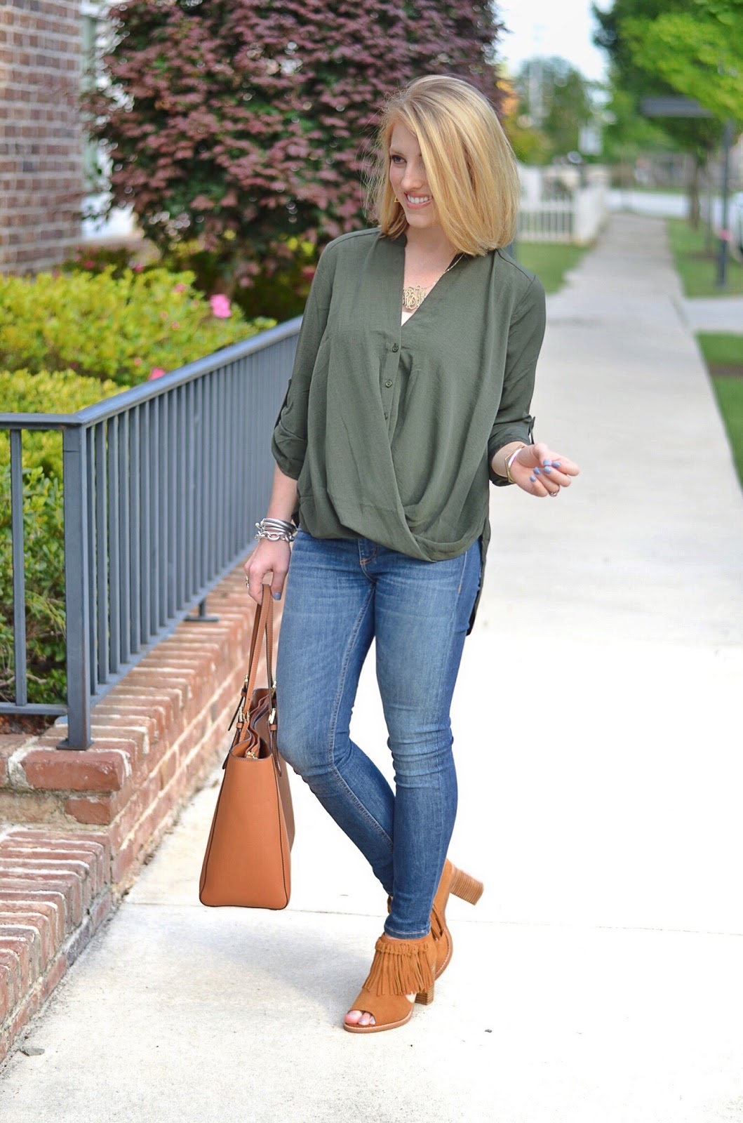 That is so cute! The wrap shirts are definitely catching my eye this season. Those fringe shoes are adorable too! Cute outfit!
