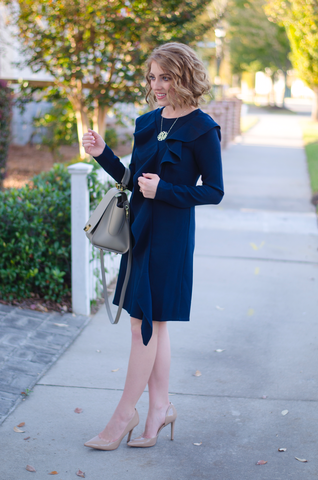 Such a gorgeous dress, Rachel! I love navy, and it would be absolutely perfect to wear to work. At that price point, I need to just scoop it up! Those nude pumps are beautiful.