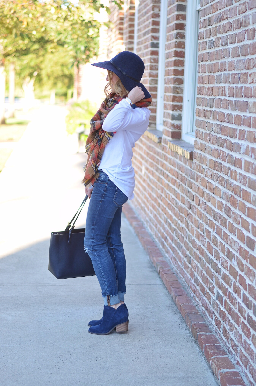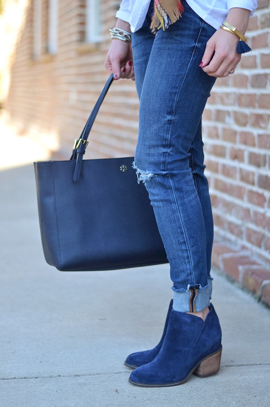 Happy Friday! Every so often, I style my outfits with all navy accessories and am instantly reminded of how much I love the color navy! Navy is my go-to, and I love seeing a clean navy outfit. Having a LND (little navy dress) in your closet is just as important as having a LBD, in my opinion. With my love for navy, I knew that a pair of navy booties and a navy wool hat would be great accessories to have. So many my scarves this season have navy in them, so these accessories have been on repeat lately.