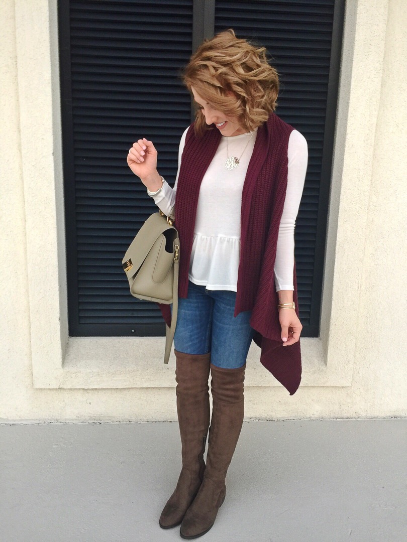 White Ruffle Hem Tee (only $21!!!) // Cardigan (same one in first picture but worn a little differently) // Denim // OTK Boots // Bag // Necklace
