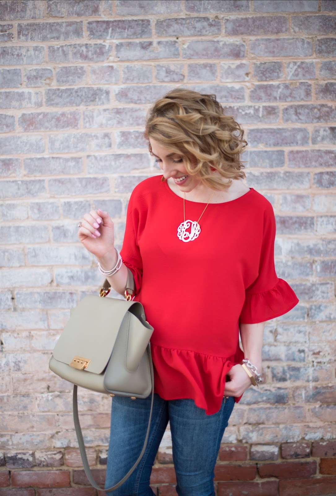 Me: Ruffle Hem Top (Absolutely obsessed! Comes in four colors and is under $50) // Denim // Lace-Up Backless Flats // ZAC Zac Posen Bag // Monogram Necklace