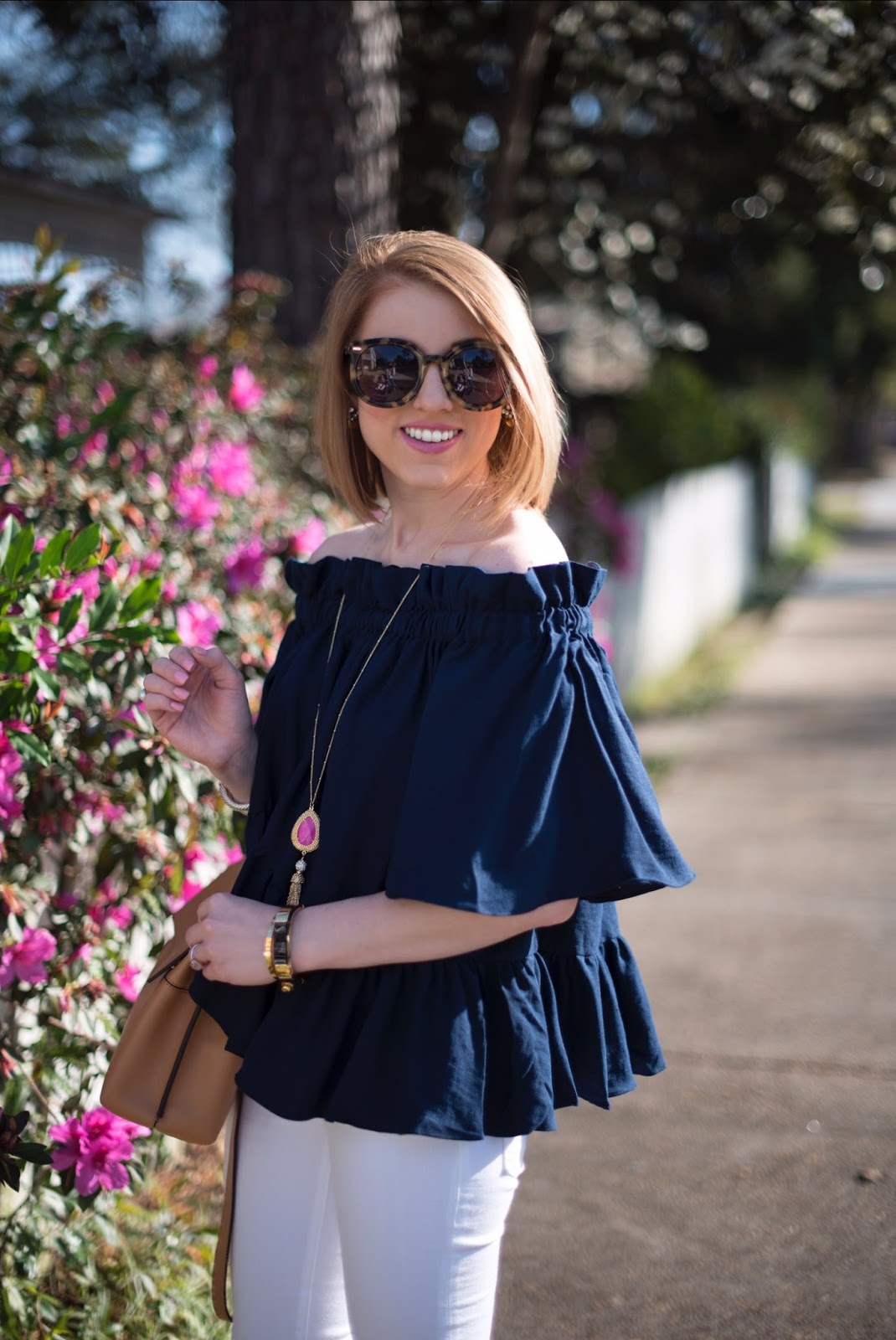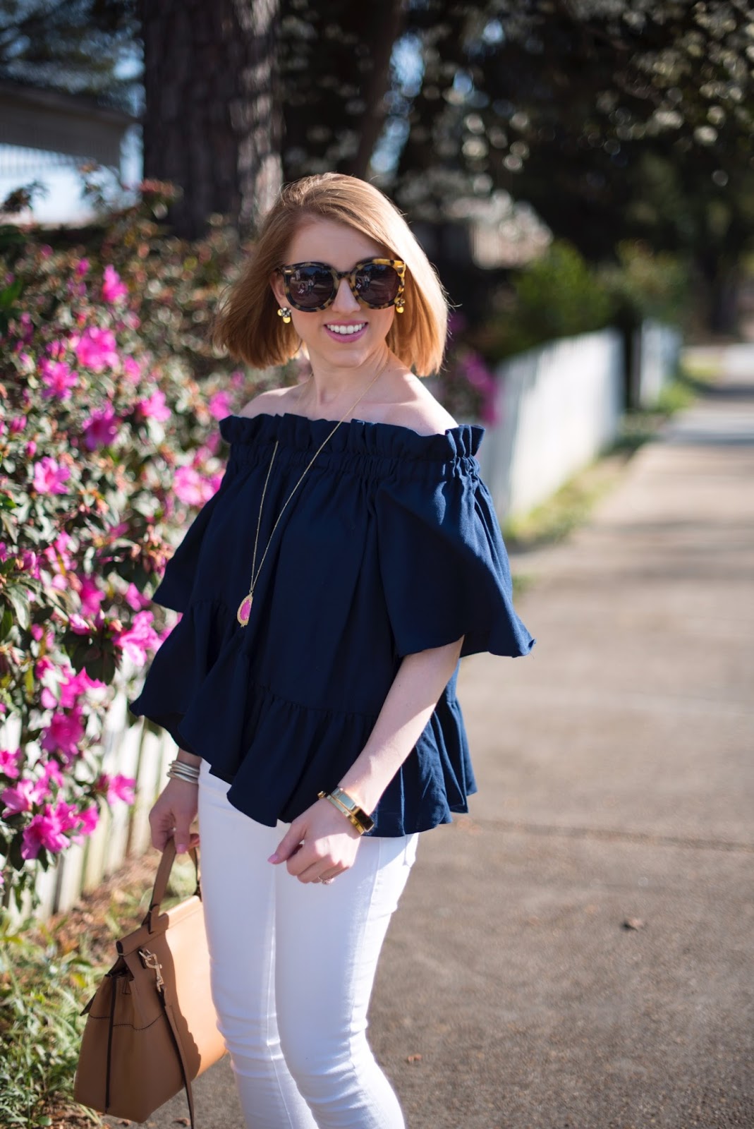 Happy Wednesday, Y’all! When you wear an outfit that fits your personality perfectly, it just makes you feel all happy inside! That’s the way I feel about this outfit. I’ve always loved a clean navy and white look. Add in some ruffle plus pops of pink and there you go! This ADORABLE off the shoulder ruffle hem top is one of the cutest I’ve every owned. It has the asymmetrical details to the hem and is such an easy breezy piece. I will definitely be loving this piece all spring and summer long. It’s only $52! Trust me, you need it in your life 🙂