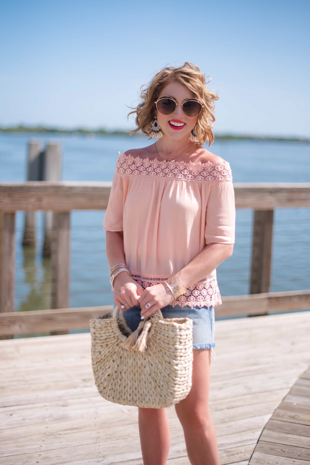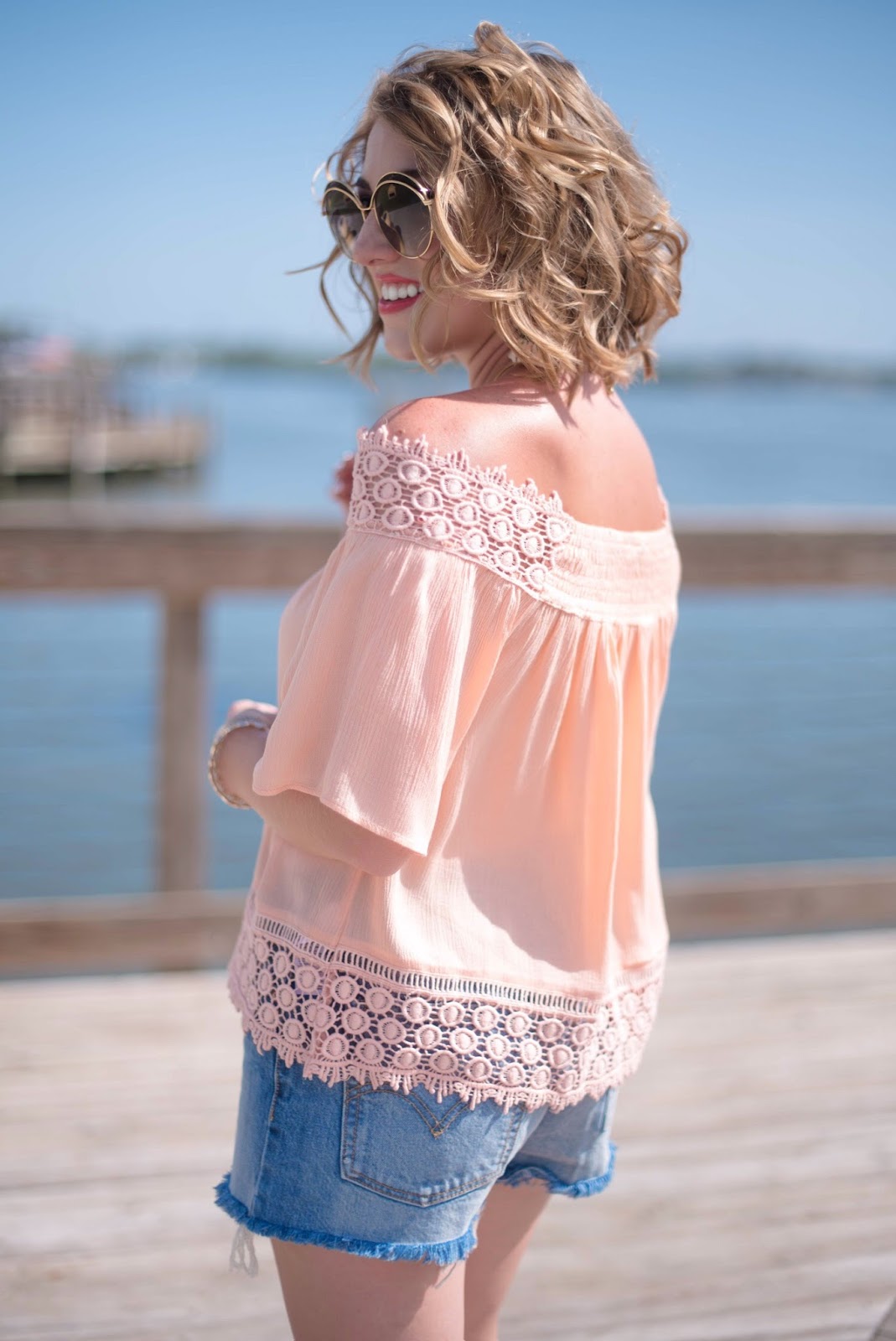 Today’s look is featuring my go-to style tip that I have come to love as a mom: separates!! I absolutely love buying up cute, breezy tops for summer to pair with my shorts and pants. I mentioned on here two weeks ago that I have fallen for high waisted pants and shorts. They’re simply a mom’s dream haha. These shorts are one of the two high waisted pairs I have purchased, and I LOVE them! They do have a button-up fly instead of a zip-up one, but that isn’t as scary as it sounds. I actually love that they have this feature. And let me just say that this crochet top is even more adorable in person!! The crochet detailing is simply perfection. It also looks adorable paired with white denim, and I wore it with white shorts on our car ride home the other day. It just screams summer 🙂