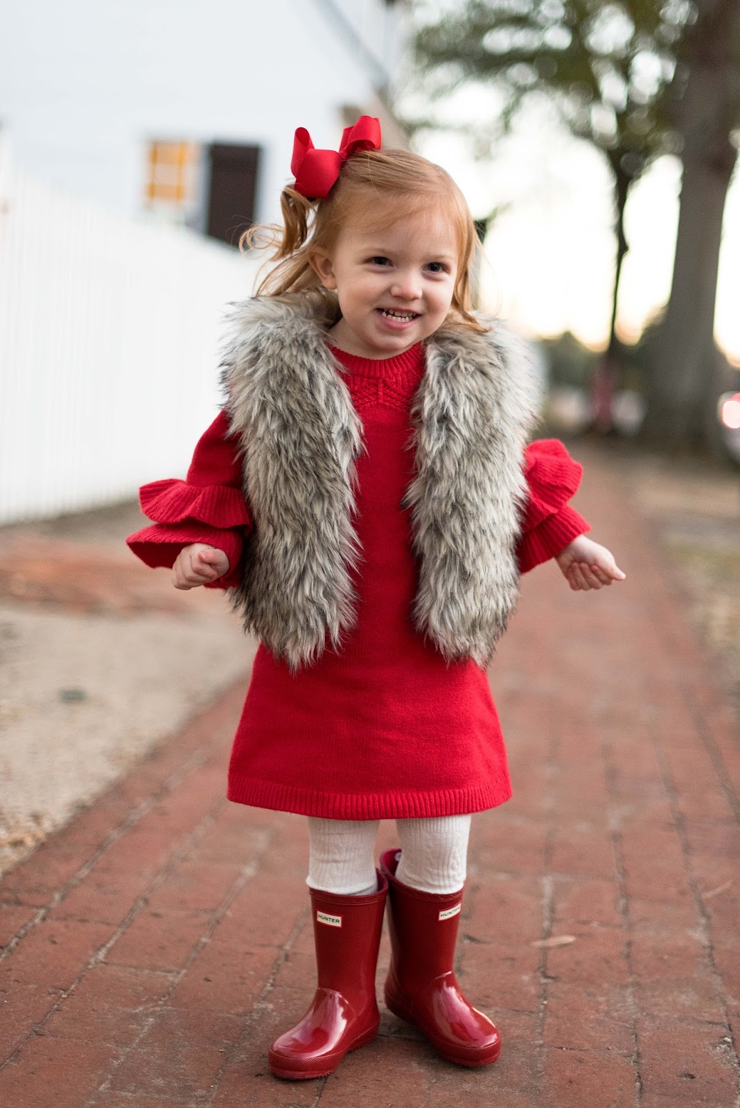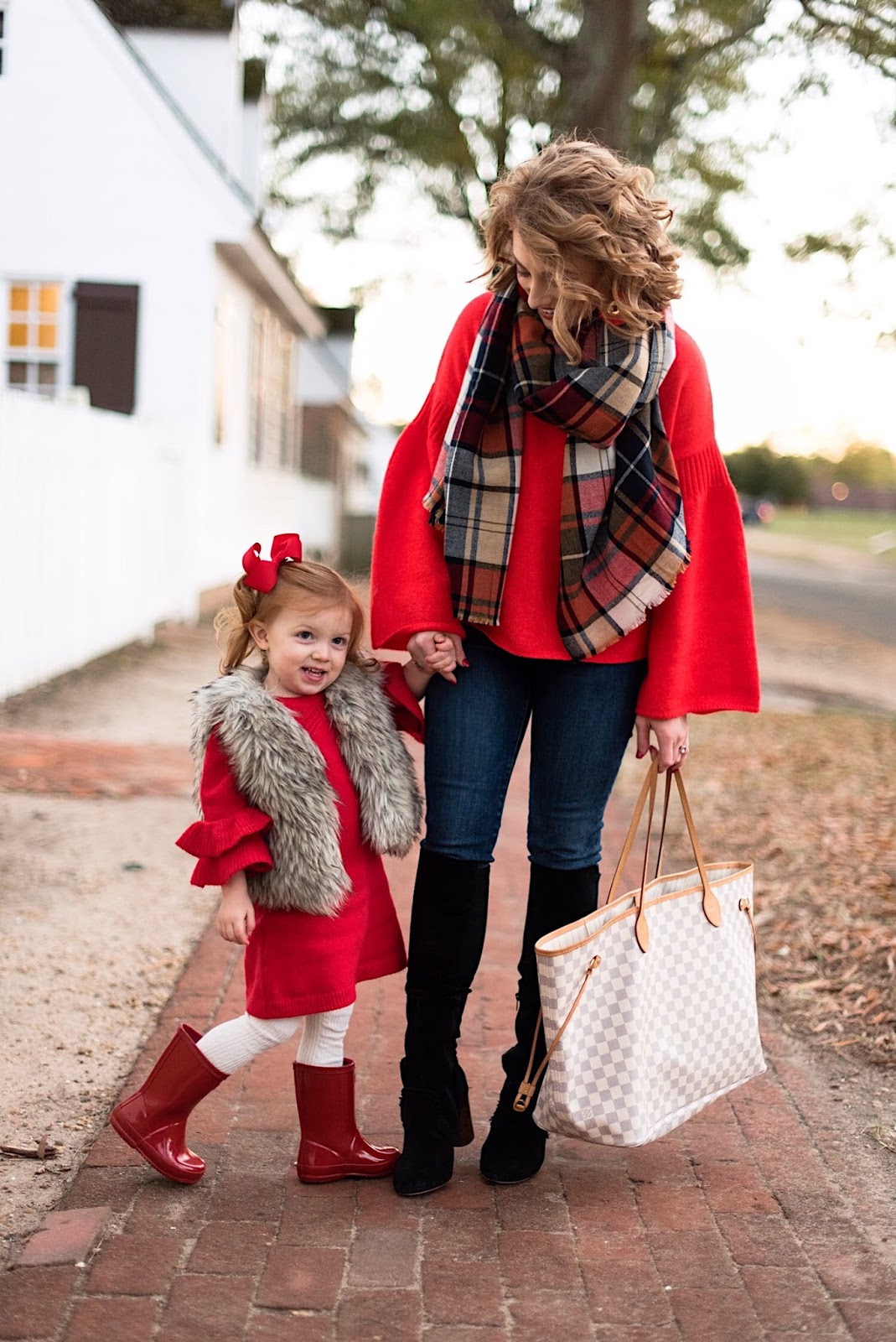 Hey friends and happy Cyber Monday! 🙂 I hope y’all had a great weekend. As y’all can see from the links to our outfits above, pretty much everything Madeline and I are wearing here is on sale for Cyber Monday! My sweater is so gorgeous with the bell and ribbed sleeves. it really is the cutest thing and is currently on sale for $34 with the code “CLICK“. See the “currently loving” widget listed at the top of the sidebar of my blog to see some other pieces that I purchased in this sale. My favorite black boots (they have the cutest little fringe detail on them) are 30% off, making them under $100. Madeline’s adorable sweater dress is not only back in stock and so perfect for Christmas, but it’s also on sale. And lastly, her faux fur vest is 50% off! There are so many good deals. I think this is the perfect mommy and me festive look to kick off the Christmas season 🙂