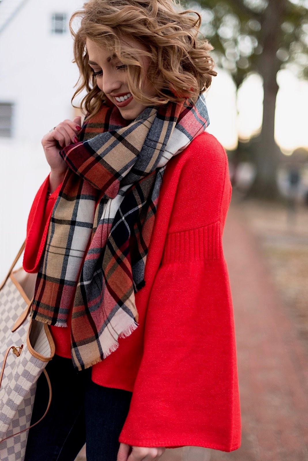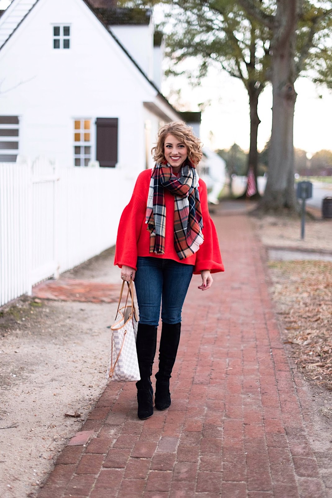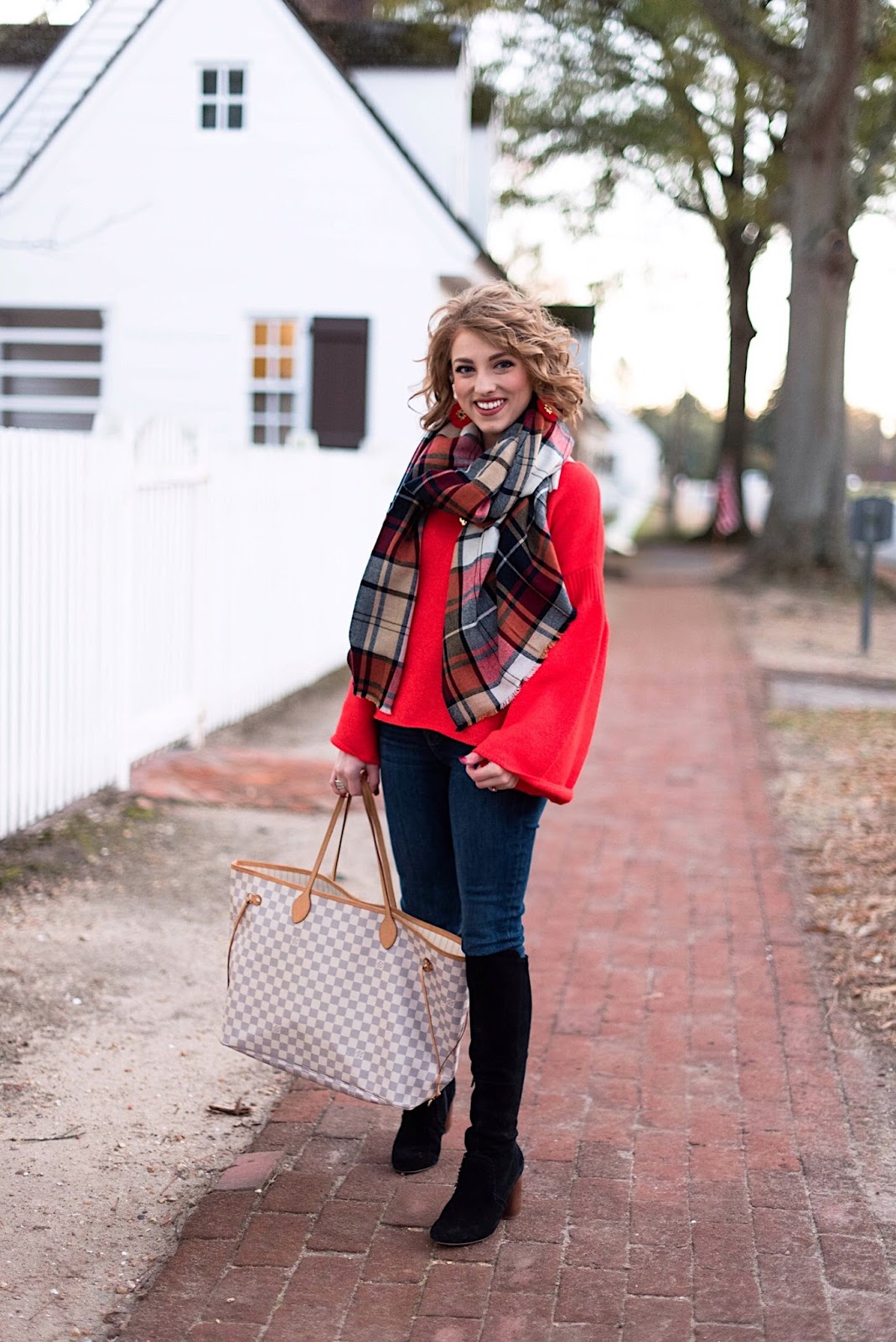 Me: Sweater (50% off with code CLICK) // Plaid Scarf // Jeans // Louis Vuitton Neverfull GM // Boots (30% off, making them under $100!) // Earrings (35% off with the code CYBER35)