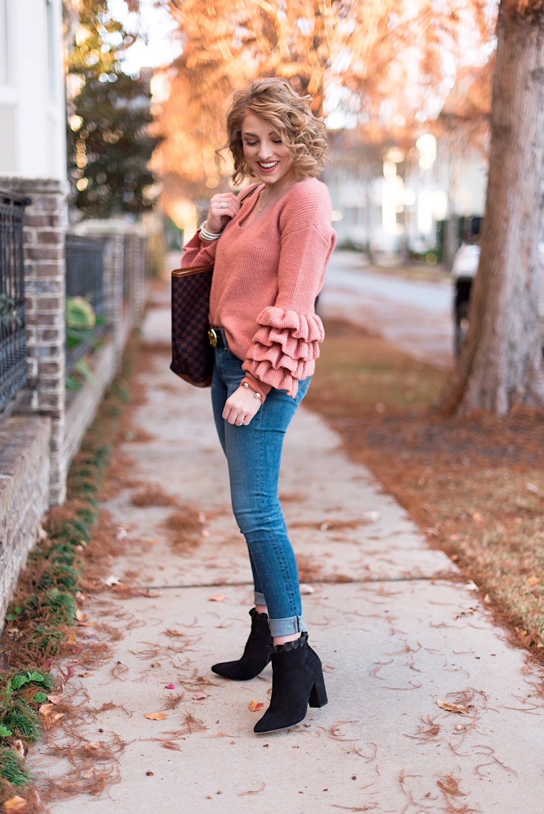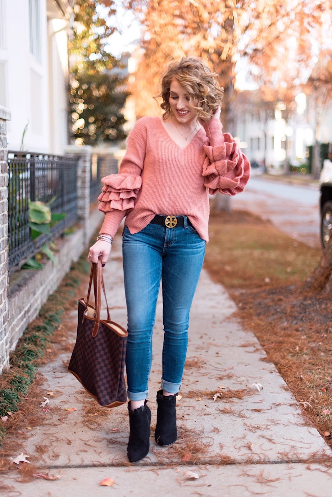 Today I’m excited to be styling and sharing with y’all one of my recent purchases. I probably own more sweaters than any other article of clothing haha, but this one has to be one of my very favorites of all time! I mean, can you blame me?! The tiered ruffle sleeves are the cutest detail and add such a fun touch. I also love that this sweater is not heavy. When you see the sleeves, you may at first think that this would be a heavy sweater, but that’s not the case. It also comes in ivory, but I’m a bit biased towards the pink. And are y’all ready for the best part? It’s only $49! I love it so much that I’m considering getting the ivory as well.