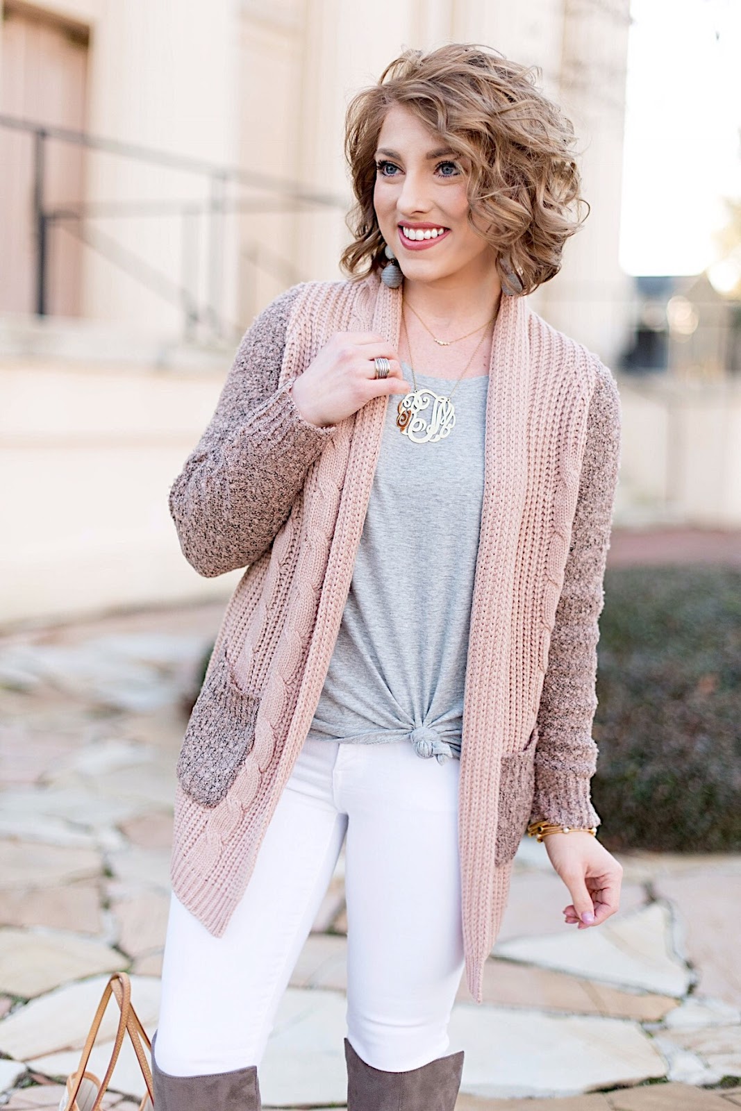 I can’t end this post without mentioning this cute, mix-knit cardigan. I love the fun touch that the mix knit with contrasting pockets adds. So. Darling. It’s under $60! I love the way it looks paired with grey. Oh, and if you want to know the secret to knotting up the front of your t-shirt as I have mine in this post, purchase one that’s either has slits on the sides or has a rounded hem, like them one I’m wearing here. That detail makes it to where you can tie it up with ease.