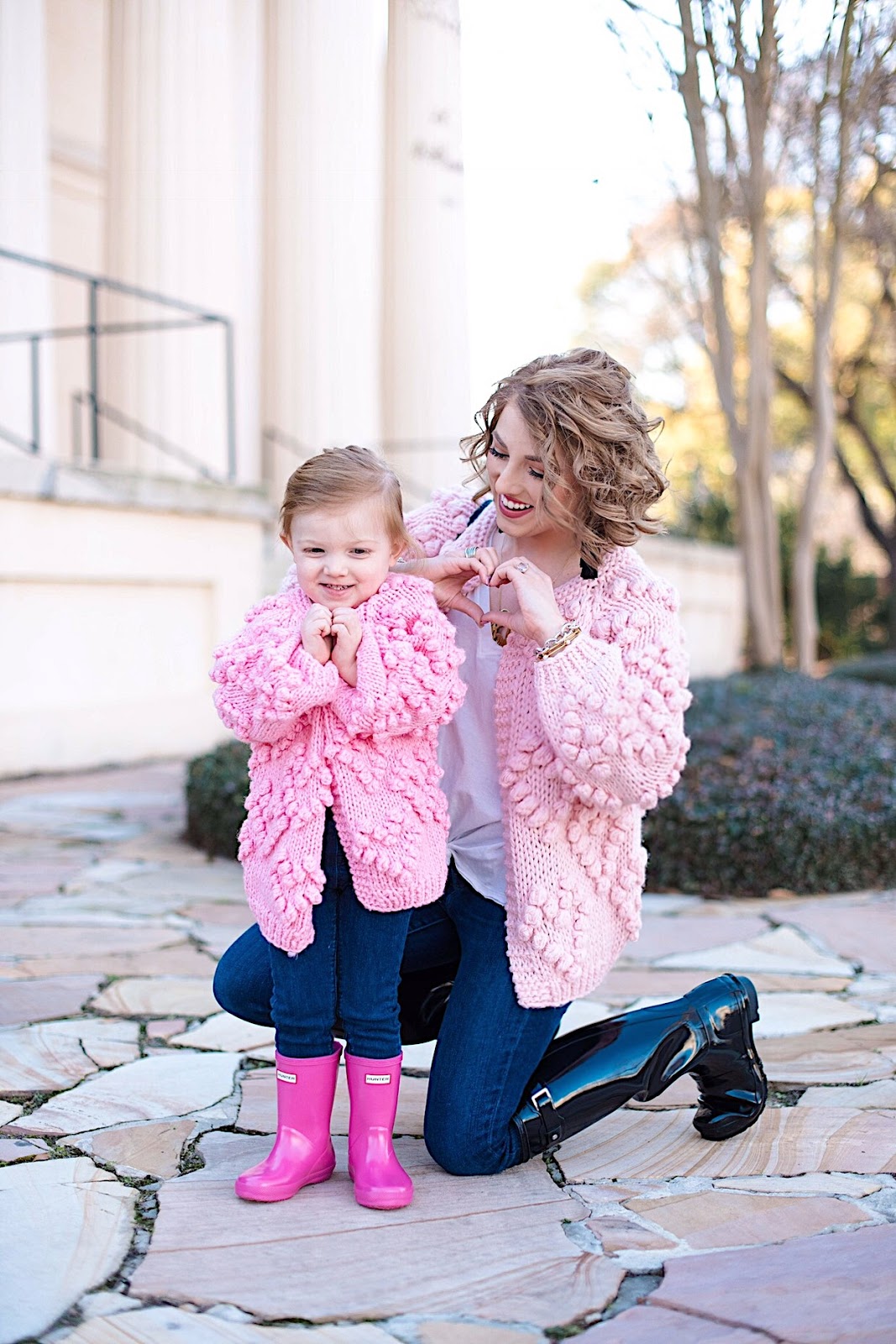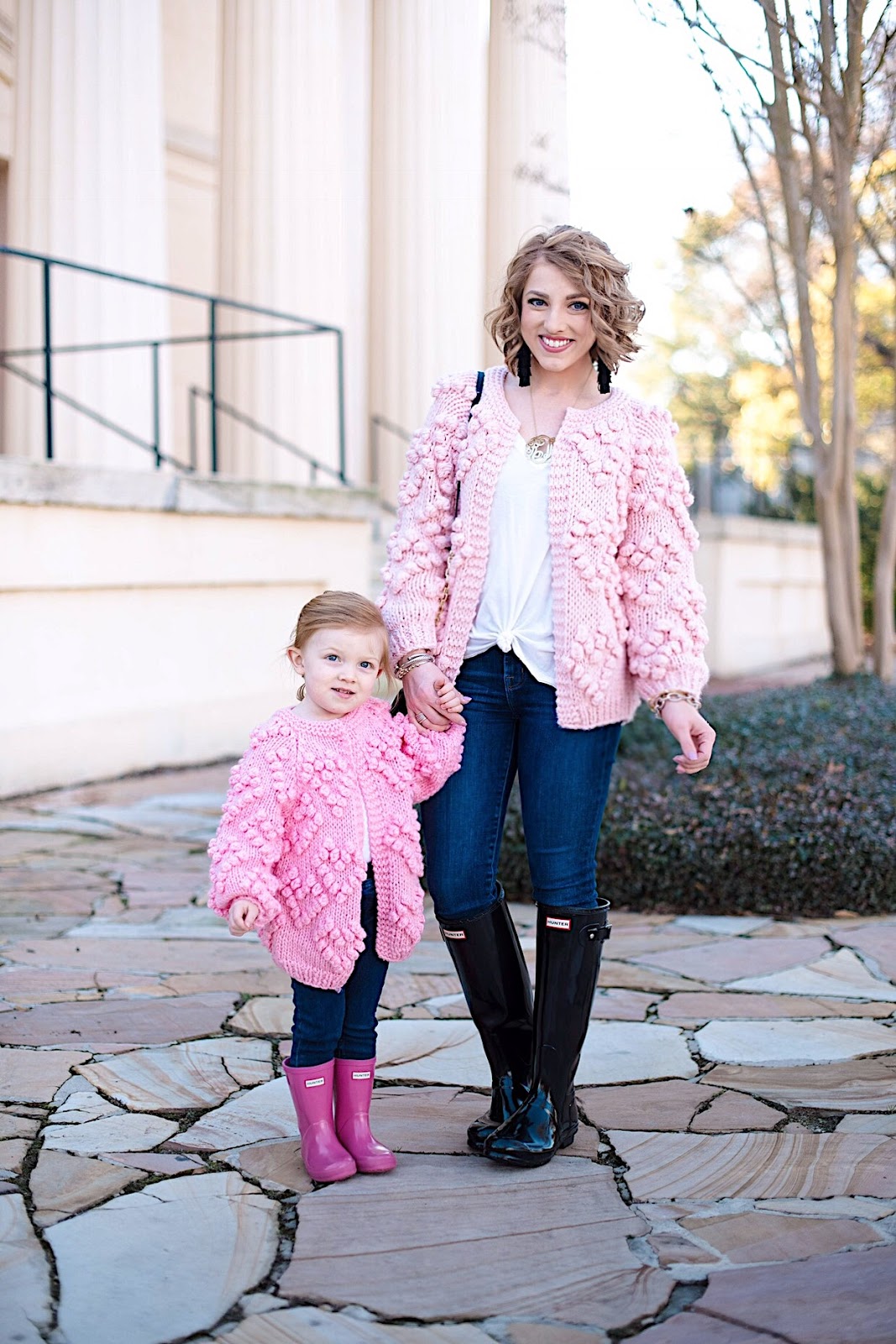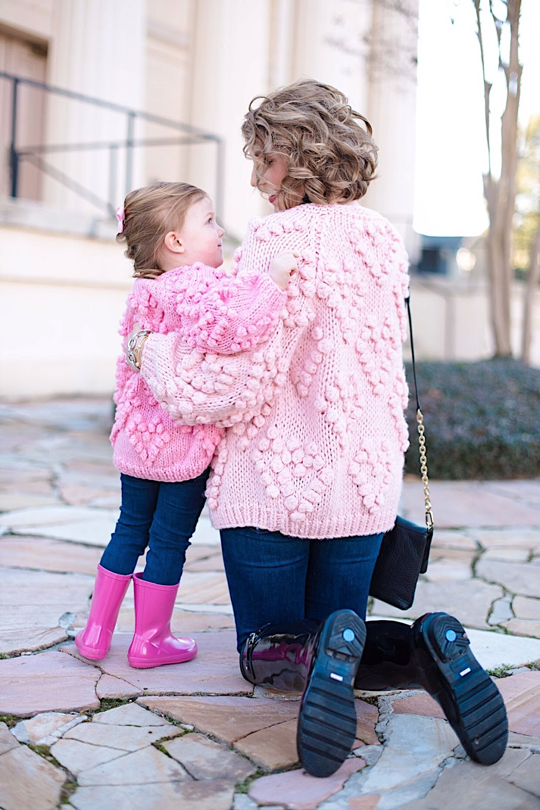 Hello friends! Happy Tuesday! Today, Madeline and I are back with the cutest mommy and me look that’s perfect for Valentines Day! If y’all remember this post from a few weeks back, I mentioned that I had actually ordered these cardigans for us and that y’all would be seeing them on here soon. Well, here they are, and I couldn’t be any more obsessed! I love how they are contrasting shades of pink. With Madeline’s pink Hunter boots throw into the mix, I absolutely love the shades of pink featured here. I am definitely a pink girl, so seeing so much pink this time of the year makes me so happy.