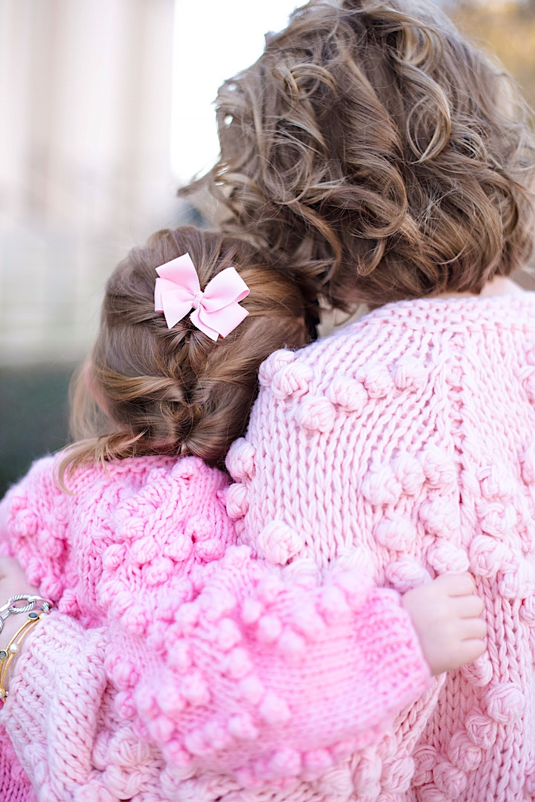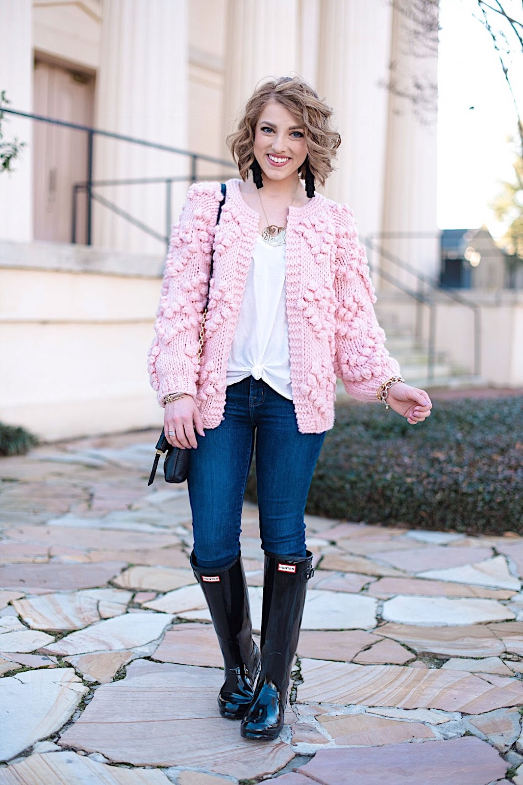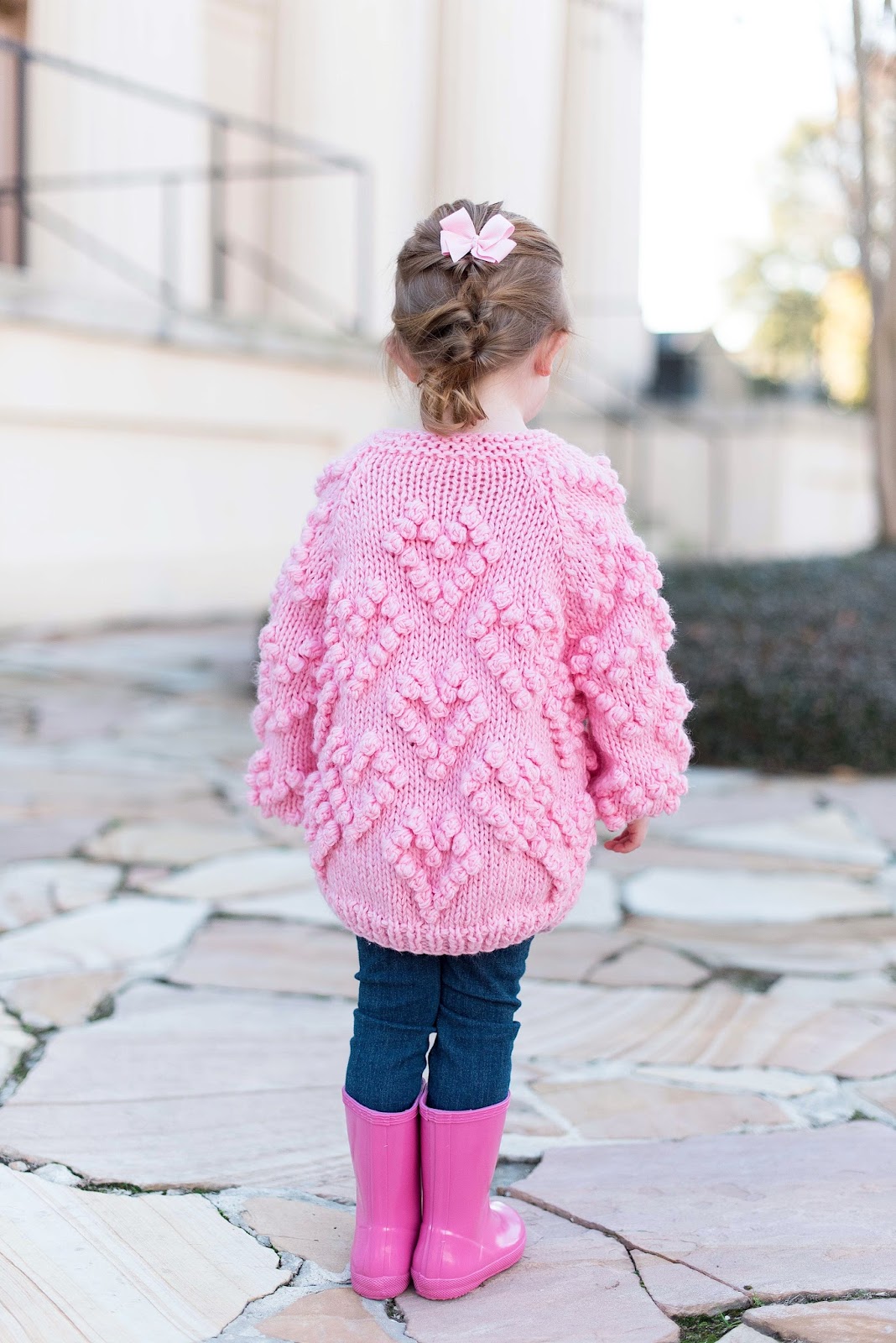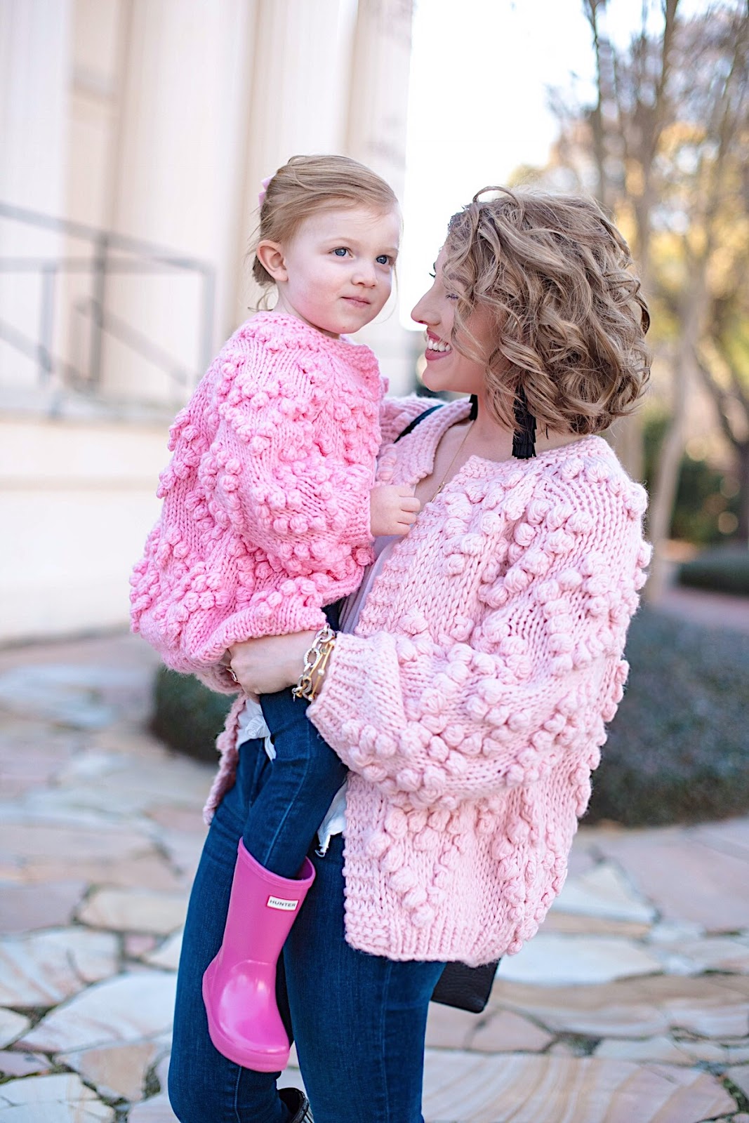 Hello friends! Happy Tuesday! Today, Madeline and I are back with the cutest mommy and me look that’s perfect for Valentines Day! If y’all remember this post from a few weeks back, I mentioned that I had actually ordered these cardigans for us and that y’all would be seeing them on here soon. Well, here they are, and I couldn’t be any more obsessed! I love how they are contrasting shades of pink. With Madeline’s pink Hunter boots throw into the mix, I absolutely love the shades of pink featured here. I am definitely a pink girl, so seeing so much pink this time of the year makes me so happy.