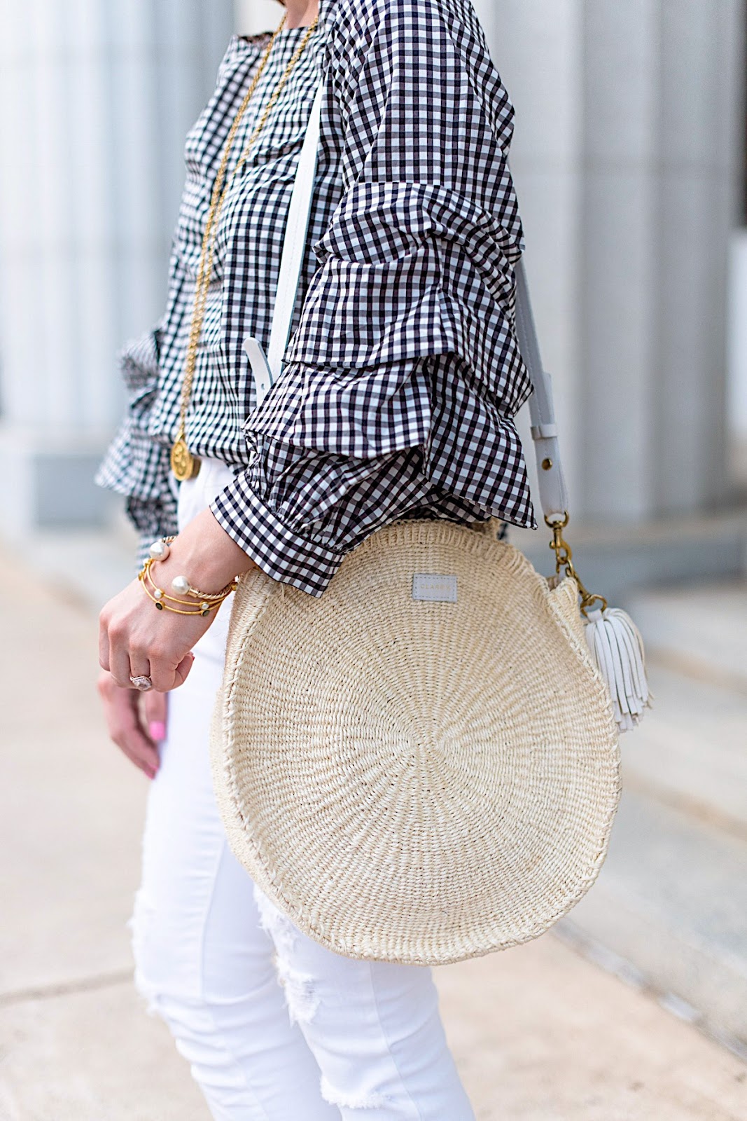 Y’all also know my love for gingham by now. I came across this darling gingham top for myself and fell in love with the sleeve detail. I purchased a navy blue gingham top around this time last year and remembered getting so much wear out of it. So when I saw this one, I knew it would be a great piece to have. It’s under $100 and also comes in the cutest pink stripe print. It took me a while to finally decide on these pink suede wedges, but I’m so happy I went with them. If you follow me on Instagram and watch my stories, you know that it was quite the process deciding on the perfect pink pair. But these are them. I love that the buckles on these beauties are also pink…so unique! This particular sandal comes in nine colors and is amazing. And do y’all remember my favorite purse from last spring/summer?! Well it is without a doubt going to be a hit again this year. It’s already back in the best stores and is also new in a mini size for this year! It’s on my spring wish list 🙂