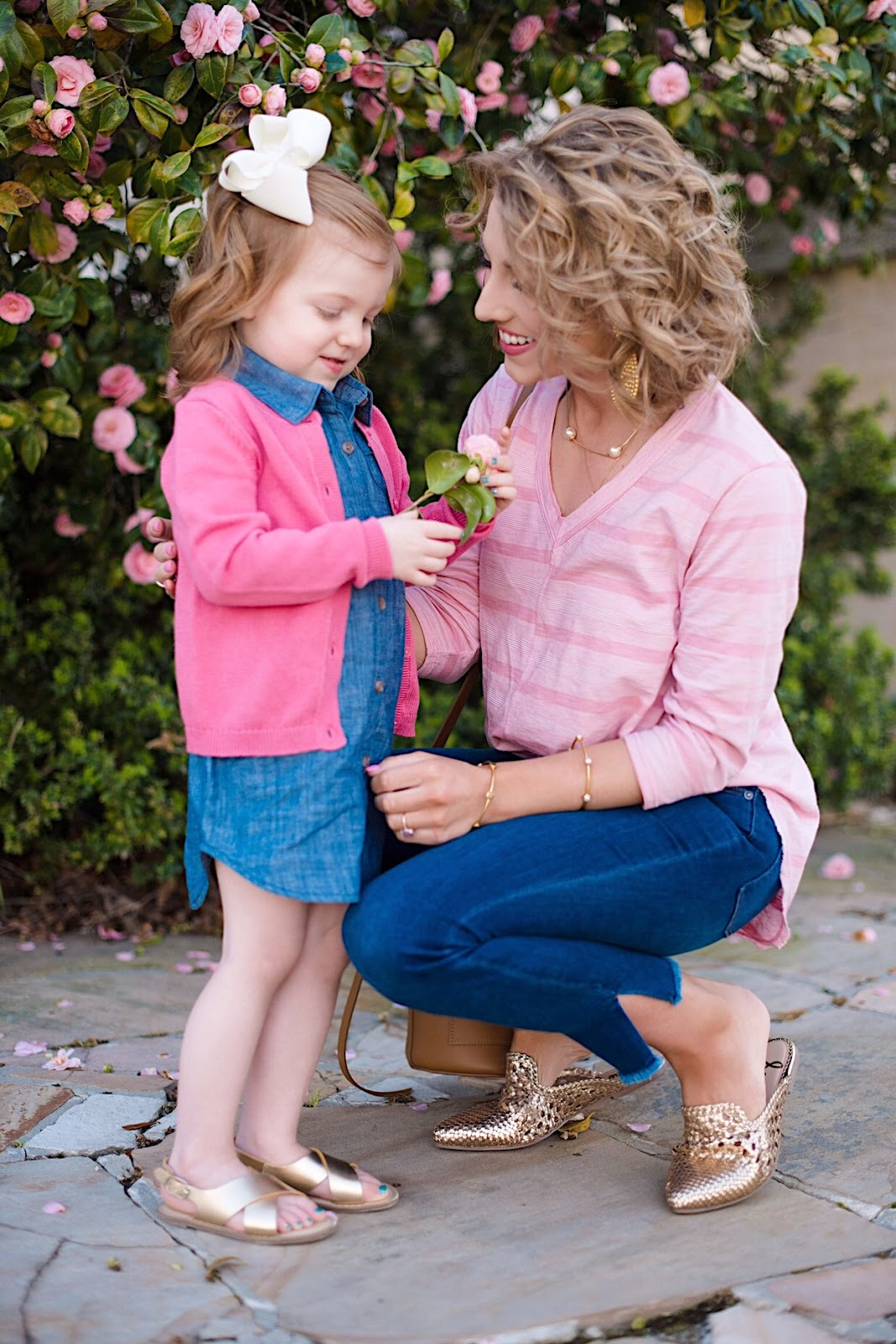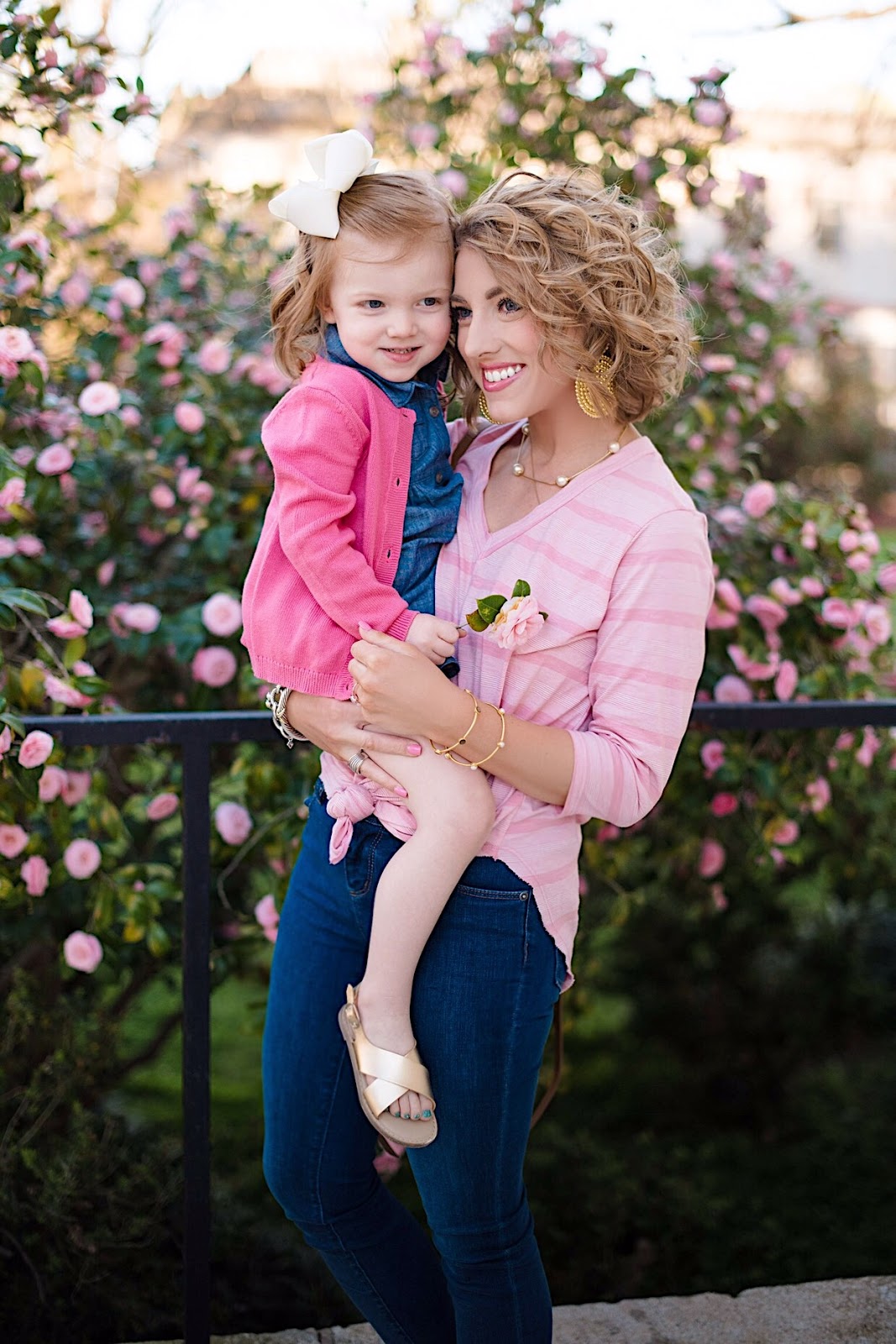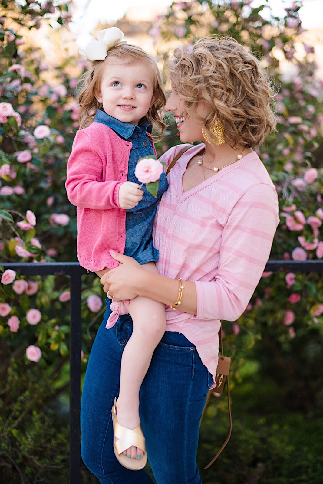 Happy Thursday, friends! Madeline and I are back today for a fun mommy and me look. I love this one so much, because it’s so easy. Her little outfit is perfect for everyday play or being out and about. My look is also the perfect everyday look for running errands and simply going about normal day activities. Also, the gorgeous pink blooms everywhere are making me want to wear pink now more than ever haha. I just love this time of the year so very much. When we were taking these pictures, Madeline picked up a few of the flowers. What I didn’t know is that she stuffed them all in the camera bag, and I found them later that night when unpacking everything. I think she shares her Mama’s love for pretty flowers 🙂 Also, I can’t believe we’re already into March!