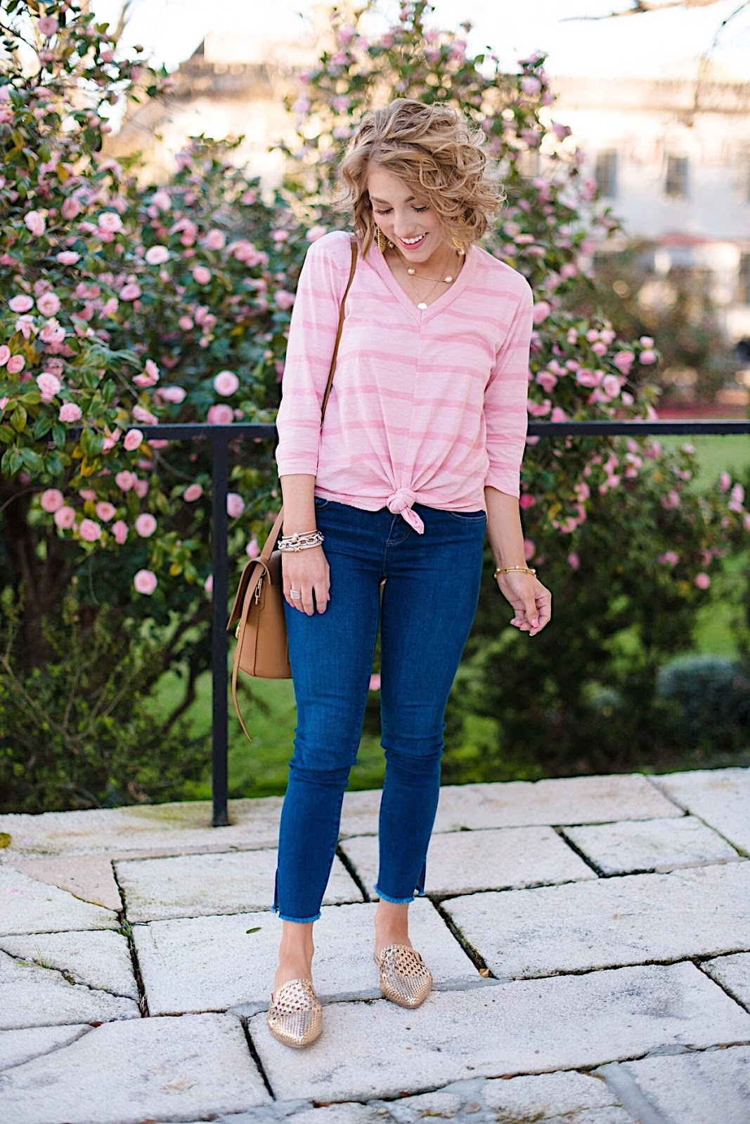 Now for a little about our looks. My tunic is one of the best things I’ve seen in a really long time. I picked it up over the weekend and have a feeling that I’m going to get tons of use out of it. I’ve already worn it three times since purchasing it! It comes in three colors and is under $80. Here’s why it’s so great. It has a rounded hem in the front and back. Since it has this detail and cuts up higher on the sides, it is such a flattering fit! You can wear it hanging out, wear it front-tucked or wear it knotted. Y’all know that I like to knot or front-tuck everything. Well this tunic is perfect for just that. The soft material makes it so easy to knot or tuck in. I kind of want it in white as well 🙂