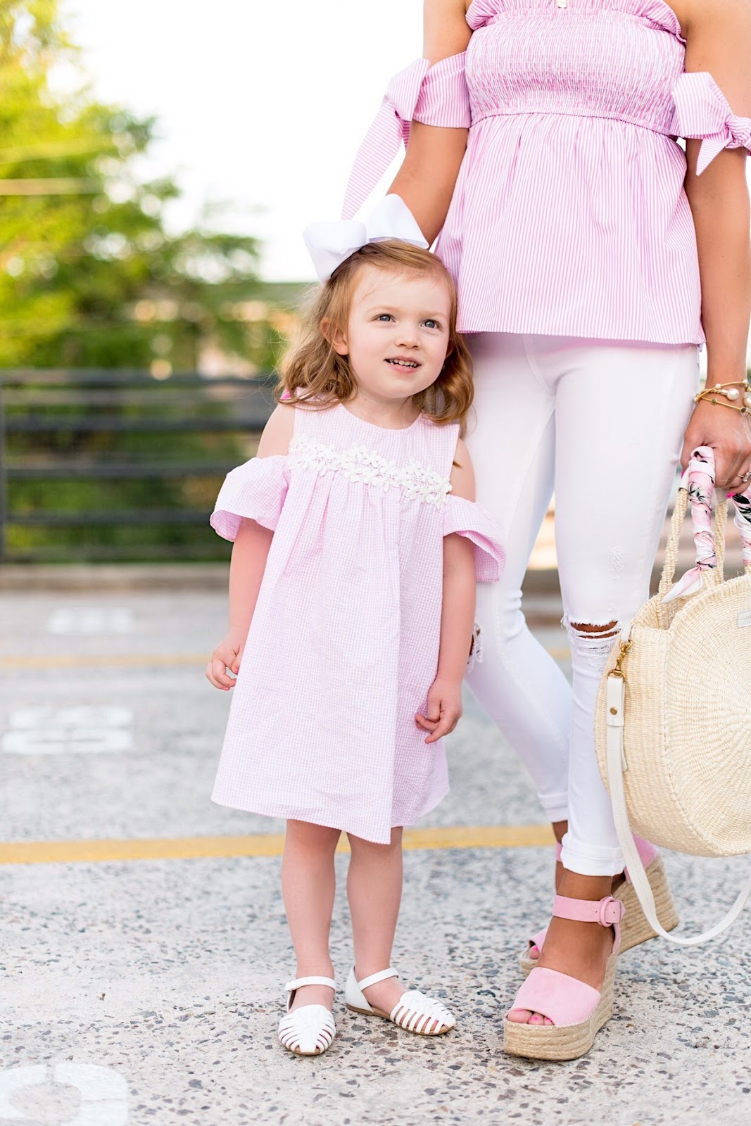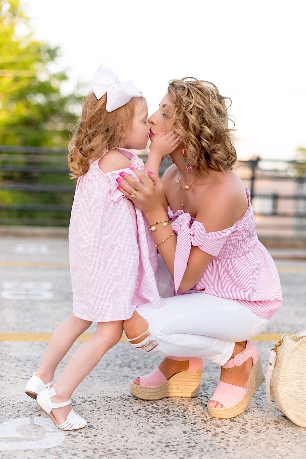 As I mentioned, this is definitely one of my very favorite mommy and me looks that I’ve ever shared on here. Pink and white will always be a favorite color pairing of mine. When I came across this bow sleeve OTS top, I instantly fell in love. So many favorite details in one top. Ruffles, smocked details, bows, pink and the list goes on. I found it available here and here. It runs TTS (wearing an XS, for reference) and is at such a great price point. Madeline’s little dress is one of my very favorites of hers. I love the lace details, the cold shoulders and again the fact that it’s pink and white. Just the sweetest little piece! It does run a bit small, I feel, so I went up one size to a 4 for her for the length. I love these photos so much, because her sweet little personality just shines through. I’m so grateful to be her mama.