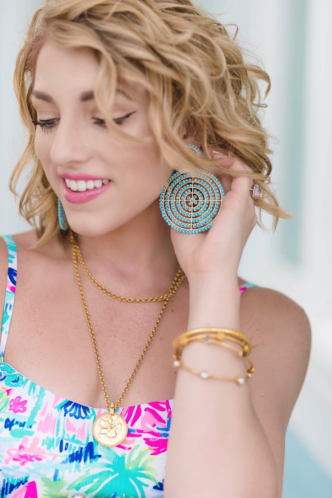 Today we are twinning in the print, “Multi Salt in the Air“. I am wearing the Shelli Stretch Shift Dress, which is amazing. I love it for so many reasons. First off, I love that it’s a more casual style dress that can be worn for everyday shenanigans. You could dress it up with a pair of wedges and throw a cardi over your shoulders for church. Or wear it with flat sandals for everyday. I also adore the little tie detail in the back. What I love most about this dress is the fact that it has (an amazing) built-in bra. That’s a huge win! I’d say it runs TTS. I’m wearing the 0. I love the way that the Lisi Lerch Disk earrings in turquoise pair with this print.