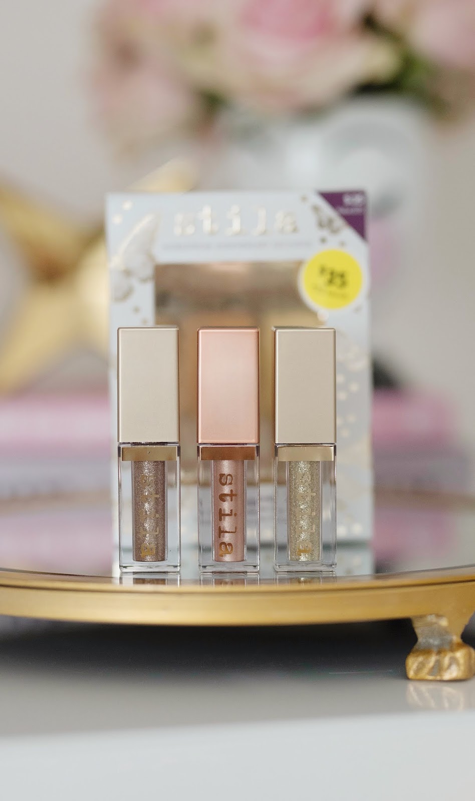 Here is yet another go-to product of mine included in the Anniversary Sale this year. Y’all have probably heard me talk about and rave over the Stila liquid eyeshadows. I absolutely love to put them over my lid after I have applied my other eye shadows to complete the look. I adore a dash of glitter. And let me tell y’all, these colors are phenomenal!!! I am now hooked on the color “smoky storm” from this set (the swatch on the far left on my hand). It’s gorrrrgeous! I’m also wearing it in this post layered over the shadows I’ll be talking about next. Anyways, the “Gold Goddess” color is amazing as well and is the perfect gold. I have yet to try the “Kitten” color, but it looks beautiful as well. These glitter shadows are SO fun. I get stopped all the time with people asking what they are. One of these usually costs $24, but for $35, you get THREE full sized shadows in this set.