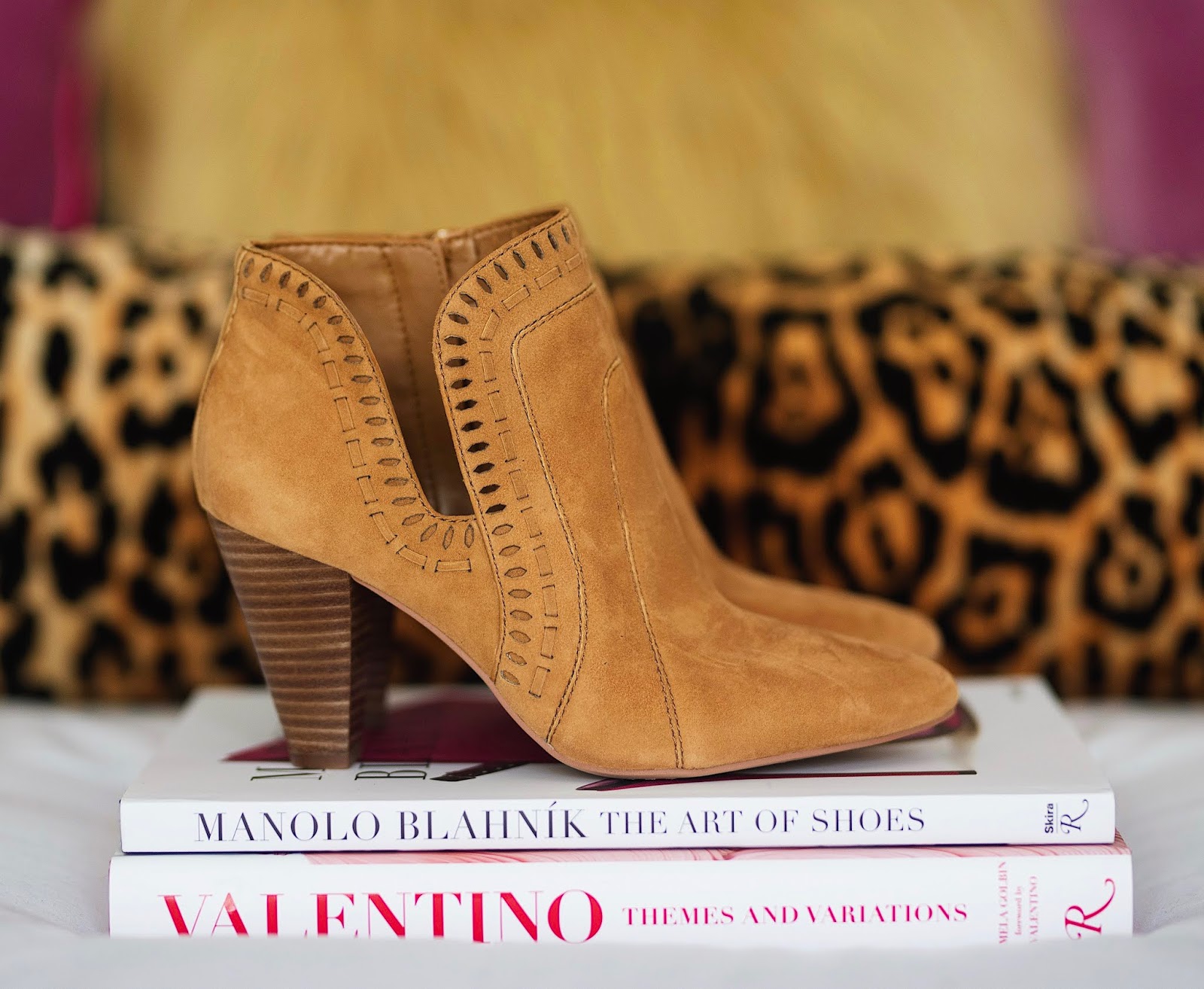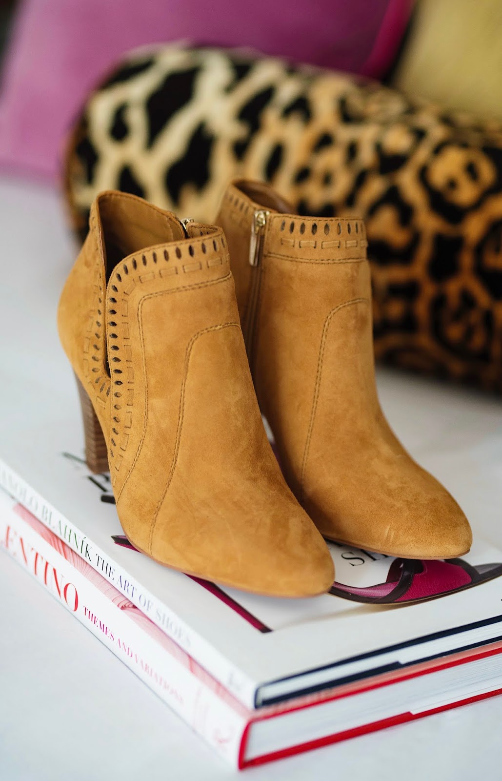 The Vince Camuto Reeista Booties are most definitely my favorite bootie that I purchased in the sale. The are GORGEOUS! Everything from the silhouette, the color, the cut out details, the heel shape…they’re amazing! They are on sale for $99 in this sale (reg. $149.95). They run TTS, I went with my regular size. I plan to style them with dresses, skirts paired with slouchy sweaters and of course jeans. These are a fall staple for sure! They come in three colors.