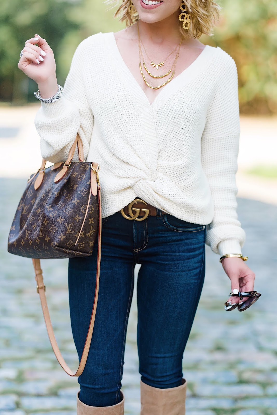 First off is this amazing twist front sweater. It would be an understatement to say I’m obsessed!!! It comes in two colors and runs TTS. Last night when I shared a preview of this look to my Instagram, my sweater was clean sold out. But today I noticed that it’s fully stocked in the coral color and is available in one size in the ivory. If you love it, run don’t walk, because it is sure to go quickly once again. And for $31? You can’t beat that. I am notorious for front-tucking my sweaters and tops, and that’s just another reason why I adore this sweater. With the twist-front detail, it gives off the look of a front-tuck without actually front-tucking haha.