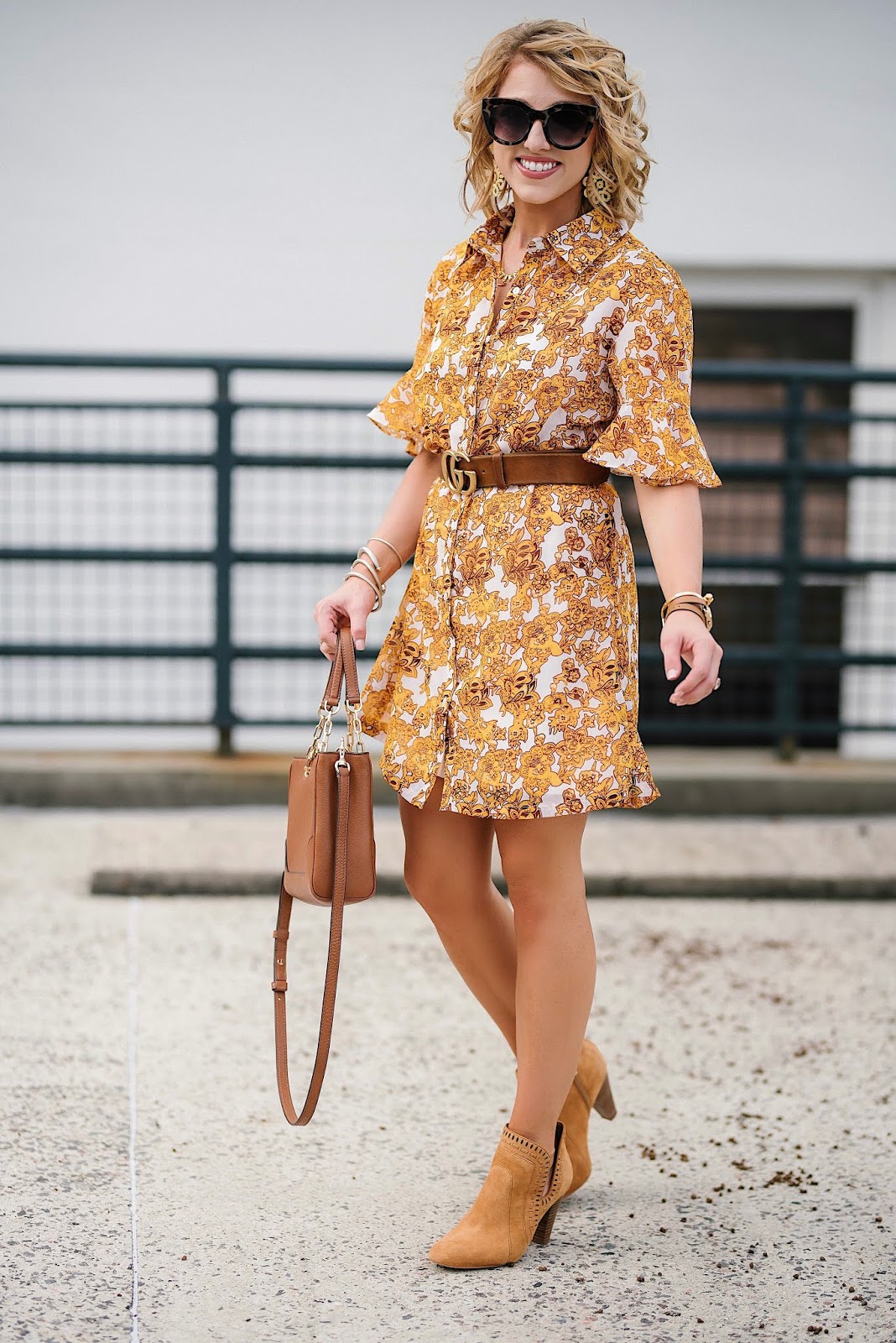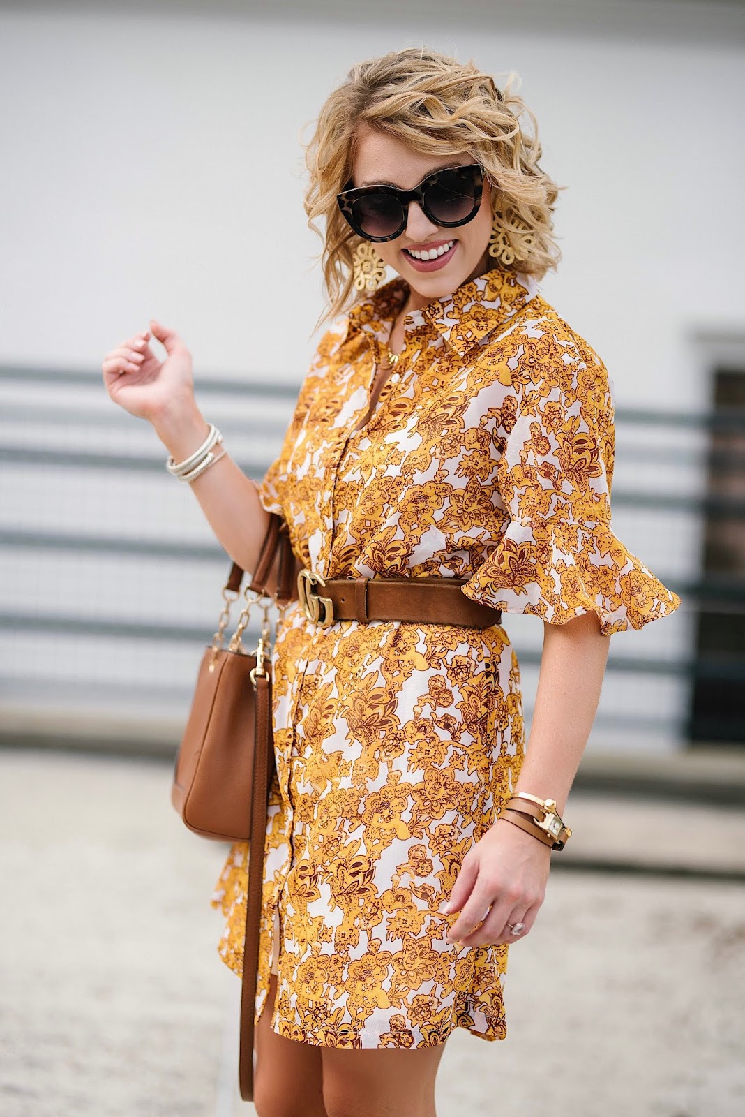 I absolutely adore wearing fall hues, which is why I am jumping on every fall transition piece I lay my eyes on. Goldens, browns, mustard yellow, olive green, burnt orange, deep pinks and ivory are the current colors that I’m so excited to wear! That is one of the reasons this absolutely gorgeous shirt dress immediately caught my eye. The combination of brown and mustard yellow gives it the prettiest golden, crisp, fall vibes, but this piece is light weight and perfect to wear now and into the fall. It is sheer but has a slip dress underneath. It is SO well made and is only $60. The fluttery, ruffle sleeves add the most darling touch! I simply cannot say enough about the gorgeous print of this dress. It it absolute perfection. It runs TTS (wearing an XS). I love the way it looks belted, which makes it perfect for all of you petite gals. Or you can of course wear it un-belted for a little more length. You can casual it down for everyday or wear it to church/work for a more dressier look with pumps. I can’t tell y’all how much I absolutely adore it.