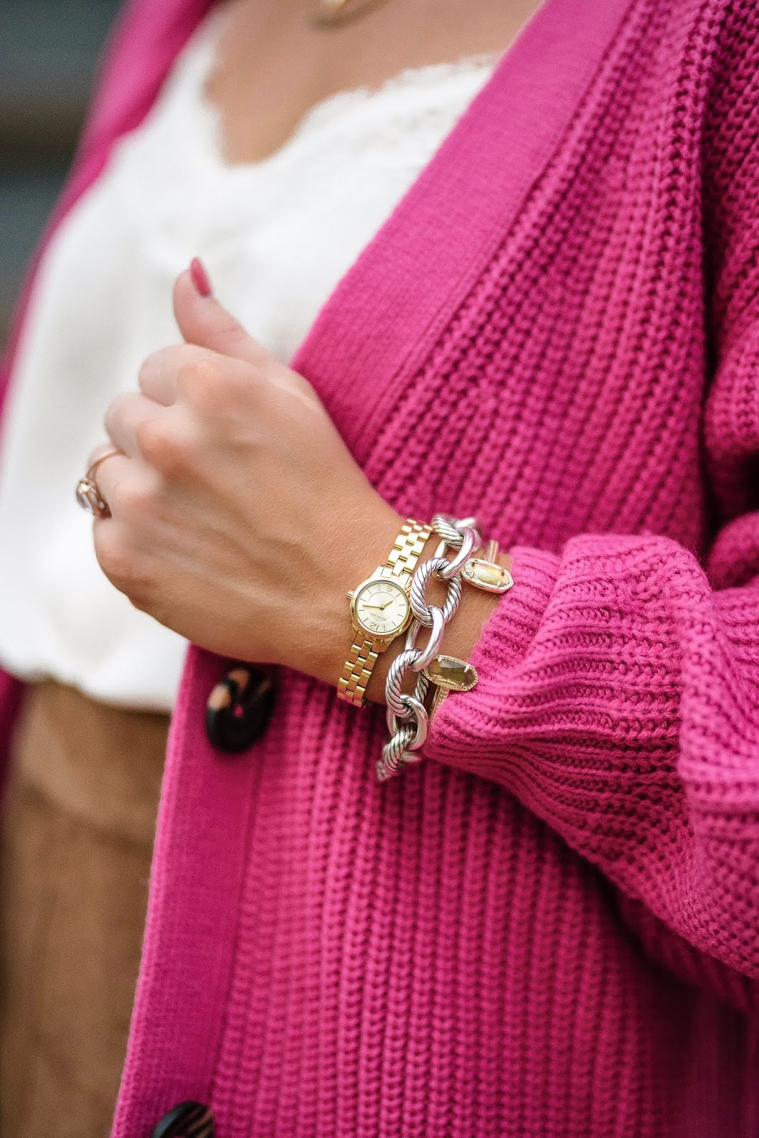 Hello friends and happy Thursday! I’m back today with a fun fall look. The combination of this hot pink boyfriend cardigan, brown corduroy skirt and leopard booties makes me SO happy. I always have been and always will be a pink girl. Even though I’m most excited to wear olive green, burnt orange, burgundy, brown and all the fun fall colors right now, I will still find a way to incorporate pink into my looks. No matter what season it is, you can always find me wearing pink 🙂