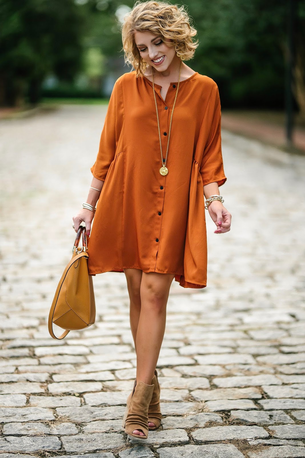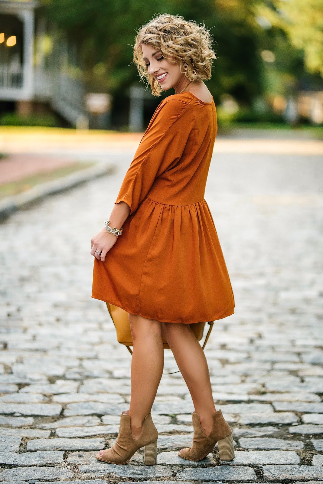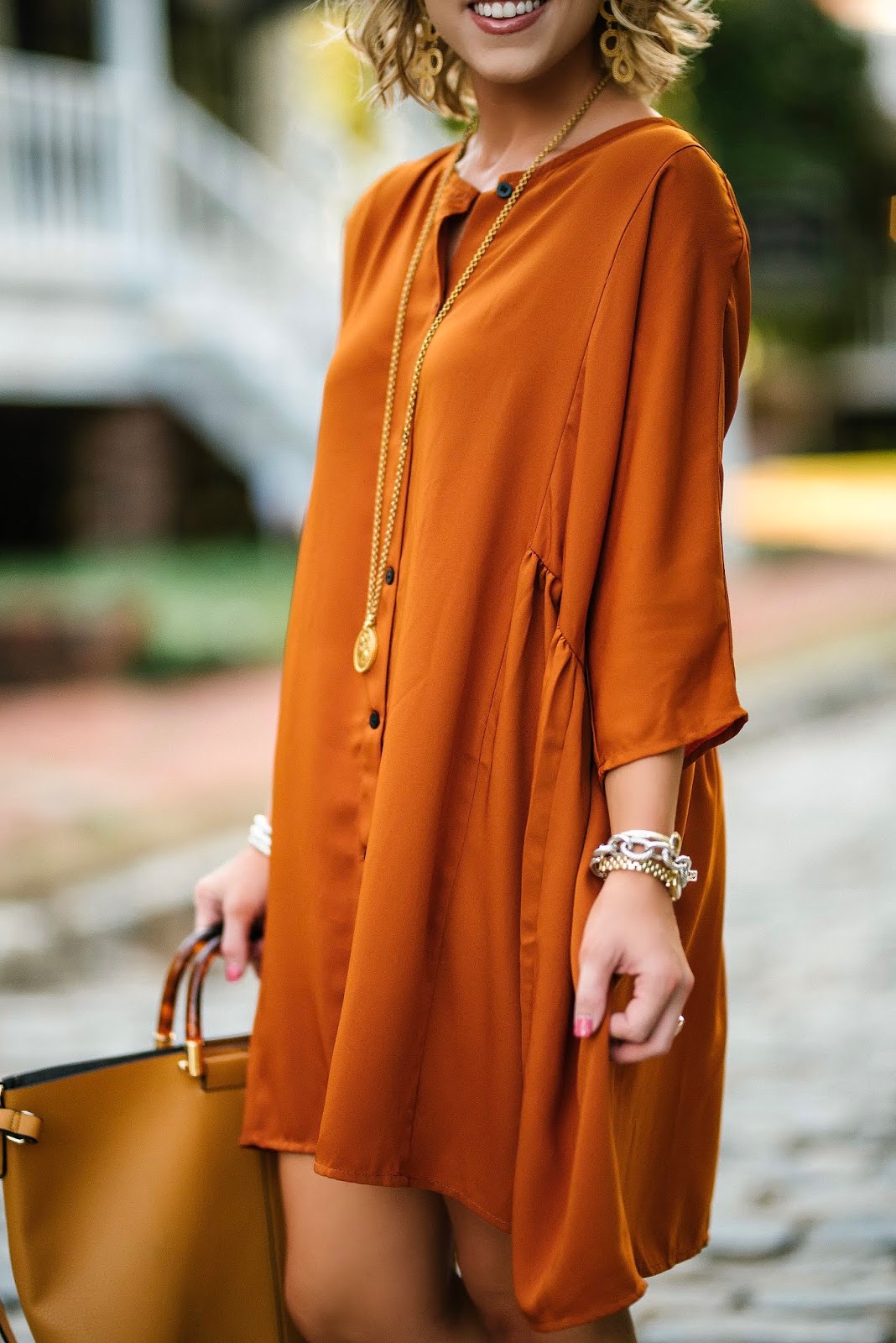 As for today’s look, rust (or burnt orange) is one of my very favorite colors for fall. I simply can’t get enough. Today I’m styling the most adorable rust swing dress for fall! In the front, it looks like a button up dress, and in the back it has the most adorable drop waist, pleated details. I couldn’t say enough good things about this dress. It’s absolutely precious and the perfect piece for fall. It’s great for now with booties and also looks amazing paired with knee high boots once it cools off some. It also comes in black and is under $50. It is most definitely a loose fit, but I ordered my regular size (a XS) and love it. I also have to mention that my watch it on sale!! I love this piece so much. It sold out so quickly where I purchased it from. But not only did I find it in stock but also ON SALE!