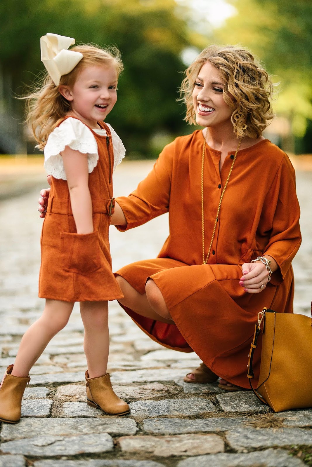 This pumpkin/rust shade looks perfect on both you & Madeline! Love the cut of the dress on you as well-super flattering!