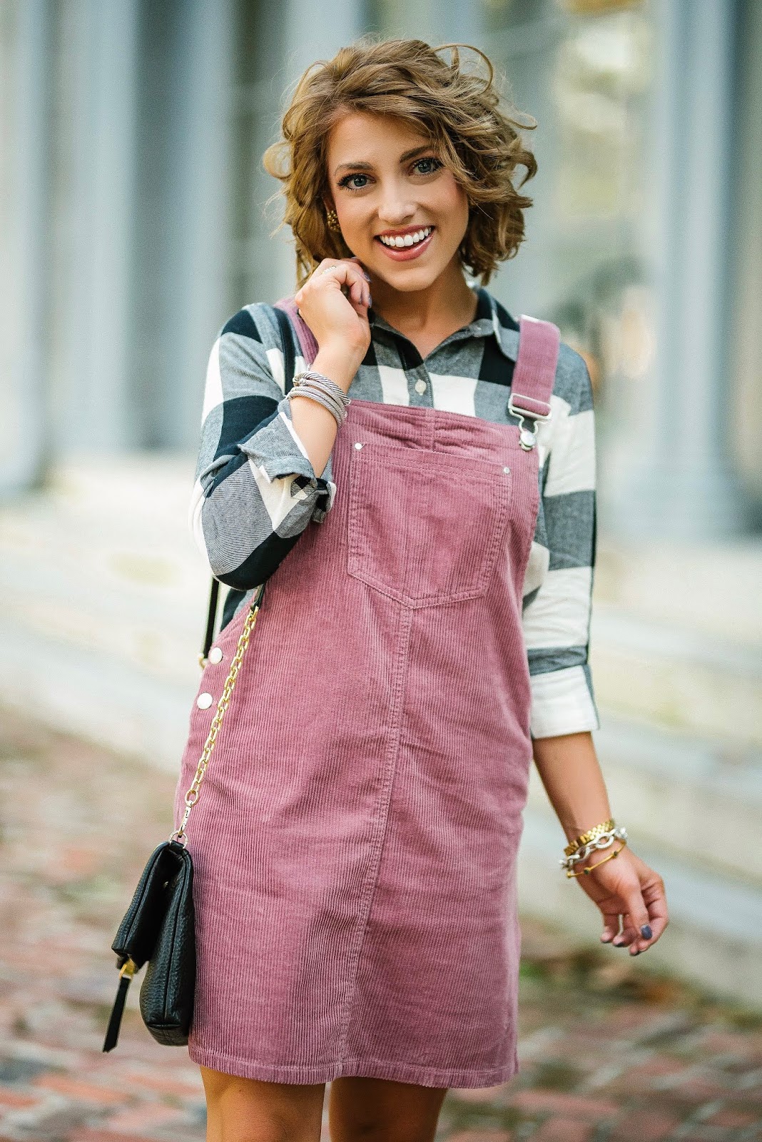 Now for a little on today’s look. I’m taking a tiny break from all of my rust, burgundy and mustard yellow (all my favorite fall colors) to share some pink and black for fall. I’m pretty much obsessed with corduroy and have been finding some of the best corduroy pieces. It all started when I came across this darling cord ruffle jumpsuit for Madeline. It’s under $30 and is too adorable for words. I also LOVE this shade of pink for fall. P.S. I would say that this one runs a little large. I ordered one size down for her, and it fits perfectly.