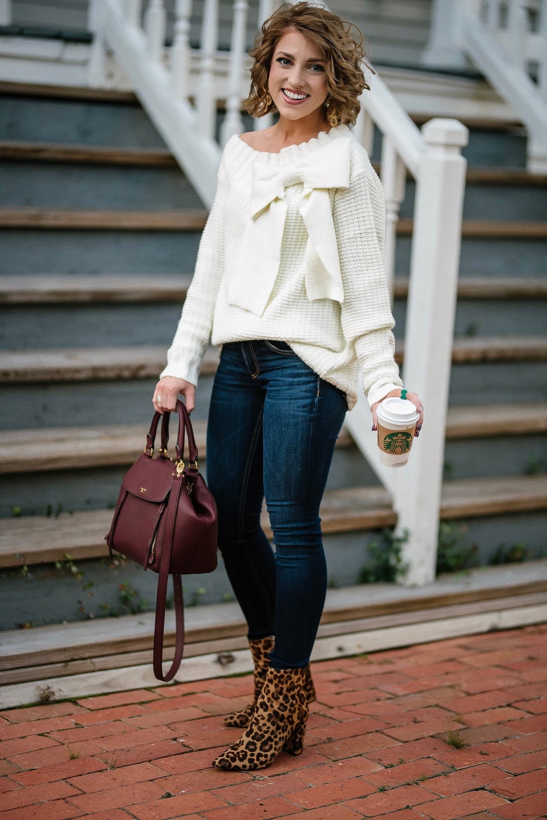 I also have to mention the fit. I ordered the US size 2 and love it. As I mentioned above, it is a more oversized fit. It’s not too oversized that you can’t front-tuck it, which I love. I decided to do this for a more fitted look. However, it is long enough to wear with leggings! I tried it on with faux leather leggings and a pair of leopard pumps, and y’all it is perfection! The ideal dressier look which would be amazing for the upcoming holidays. SO there is a way to dress it up and down. If you want to casual it down even more, throw it on with a pair of leggings and sneakers for running errands on a chilly day. I simply could not recommend this gorgeous bow statement sweater enough. It’s only $70. If you love the more oversized fit, stick with your regular size. If you want a little more fitted look, you could definitely size down one size.