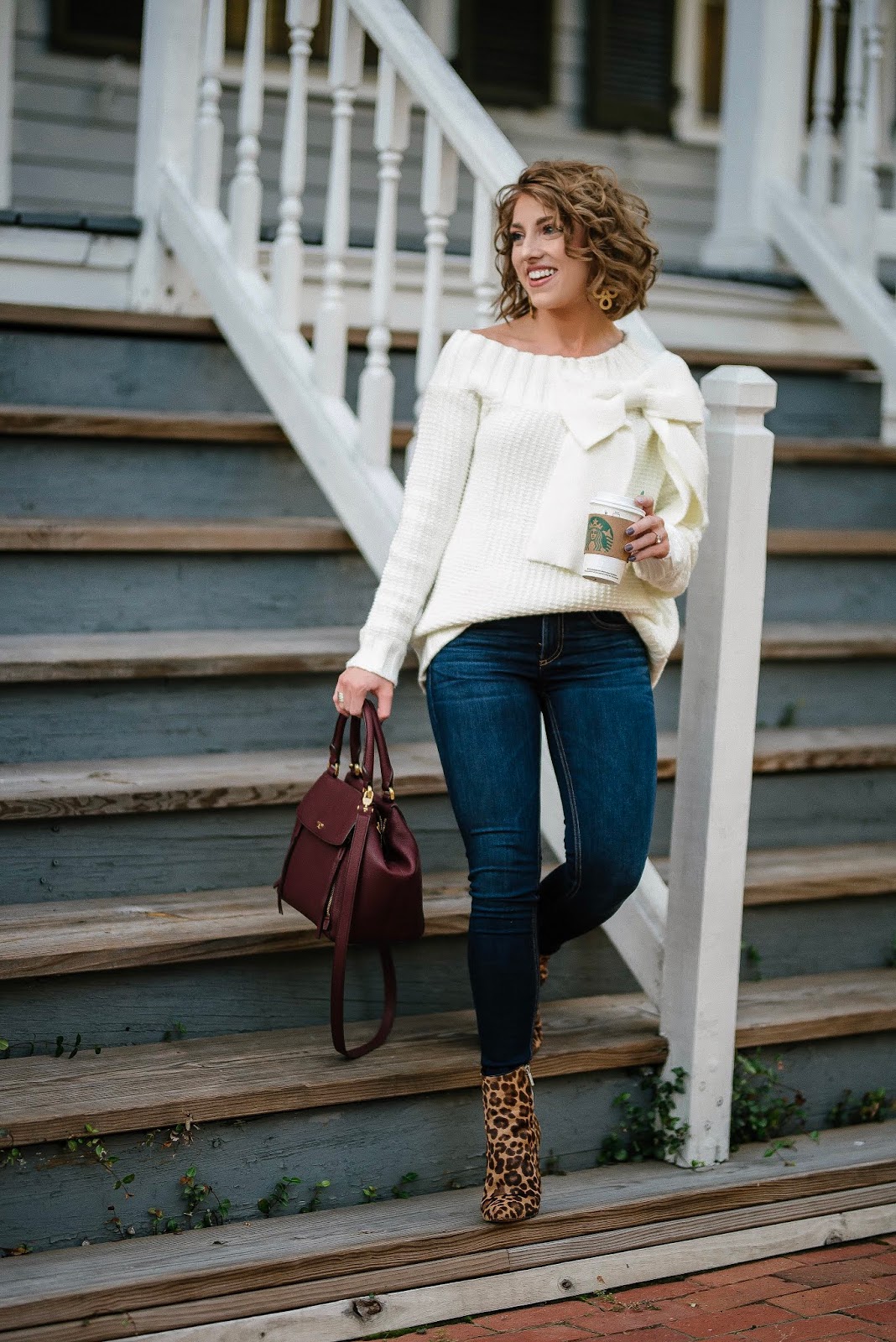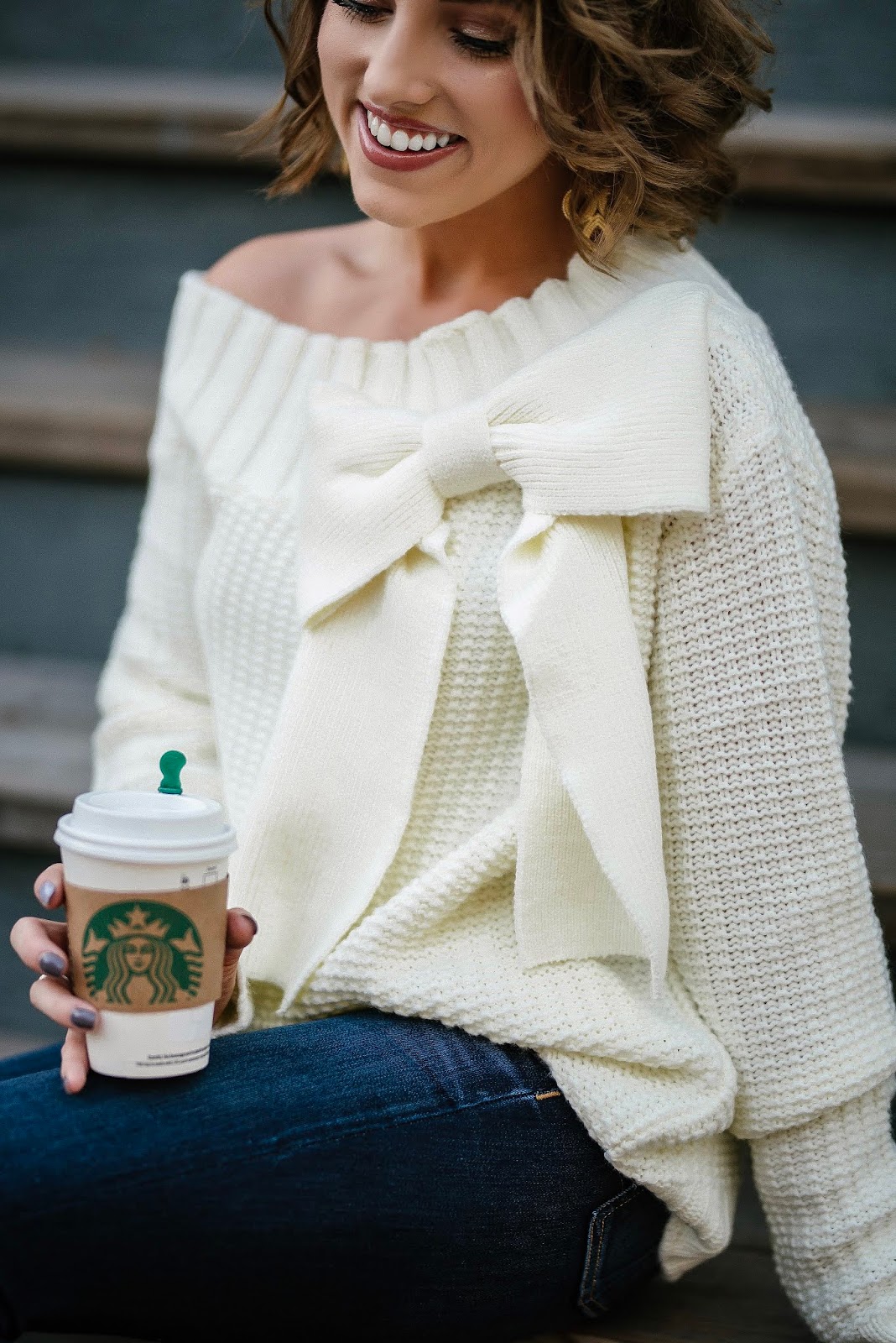 Happy Wednesday, friends! I hope y’all are having a great week so far. I am so so excited to be styling one of the cutest sweaters I have ever laid eyes on today. If you are an extreme bow lover like I am, this sweater it for you! How adorable is this big BOW sweater?! I absolutely adore a good statement bow, and this bow couldn’t be any more perfect. It’s large enough to make a statement but not too large that it feels bulky on and in your face, if you know what I mean. I actually saw this sweater online and wasn’t sure how I felt about it. It did look rather bulky and I was’t sure if I’d be able to pull it off, especially being petite. I can’t resist a good bow and decided to give it a try. I’m SO glad that I did, because I’m more than obsessed. It is an oversized fit. The model online is wearing it completely off the shoulders. When I tried it on, I immediately fell in love with this one shoulder vibe. It just feels “right” with the cut of the sweater. I think the slouching-off-one-shoulder look is so much more flattering, effortless and feminine looking. Not to mention, it just brings out the bow detailing even more. It’s definitely one of those sweaters that you can wear whatever way feels best for you 🙂