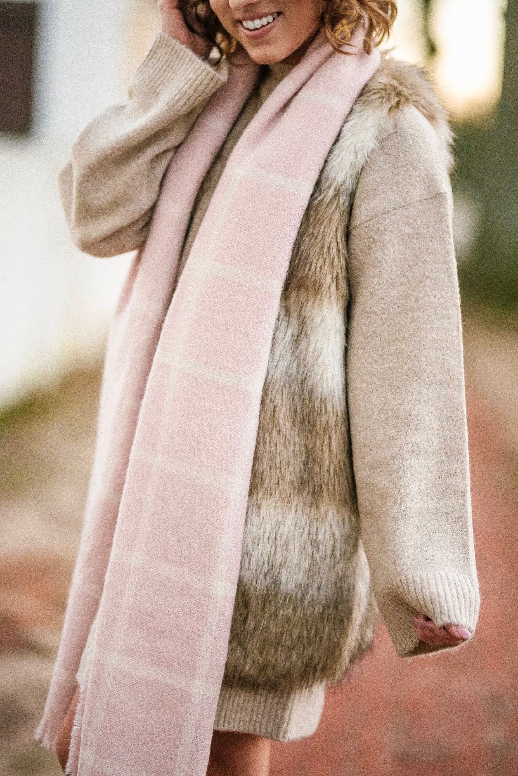 Today I’m so excited to share a look that I wore this past week when visiting Virginia. I absolutely love and cherish our time in Williamsburg. Everything is so quaint in Colonial Williamsburg. Madeline loved it so much and especially the ice rink. She got to skate for the very first time this past Sunday, and it was so much fun! Anyways, we were dressed for the chilly weather. I just adore this sweet combination of baby pink and faux fur. My faux fur vest is amazing y’all! It’s from one of my favorite stores, Chicwish, and is under $40! The quality is amazing, and I love that it’s not too bulky on. The pattern of the faux fur is just gorgeous. I couldn’t recommend this one enough. It coordinates perfectly with Madeline’s little faux fur vest as well. My sweater dress is the perfect ivory sweater dress that will go with so much! It’s under $50 and runs TTS. Madeline’s little sweater dress is just about the cutest thing. I love the details.
