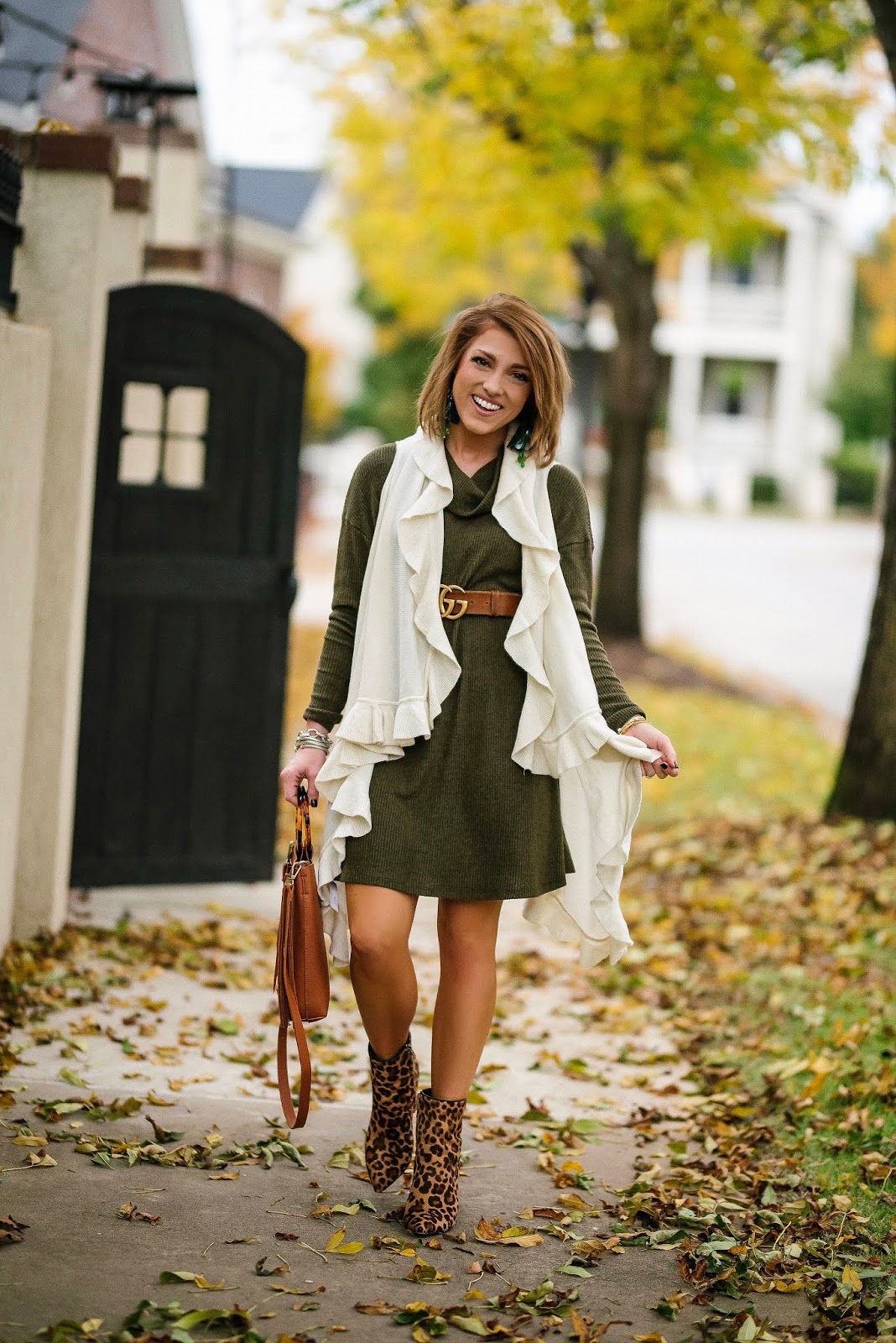 Do you know what you’re going to wear on Thanksgiving Day yet? Today I’m sharing the perfect look for Thanksgiving Day. If you’re wanting to get a little dressed up but not too dressed up, this is the perfect look! I usually like to get a little dressed up on Thanksgiving and look like I put some effort into my outfit haha, all while still being comfortable and not too dressed up. This under $50 ribbed cowl neck dress is perfect for just that! It’s SO comfortable and I just love it. It runs TTS (wearing the XS) and also comes in charcoal grey. It’s absolute perfection and so easy to style! I literally could sleep in it haha – it’s that comfy! I decided to pair it with this adorable ruffle vest for an added touch. Y’all I could not recommend this vest enough! It’s SO cute, comfortable and offers countless ways to style it. It’s on sale for under $60! I decide to pair the look with my favorite leopard booties for an extra fun touch. The pair I have has been so popular and has pretty much sold out. But I just found this pair that looks so cute and is super affordable.