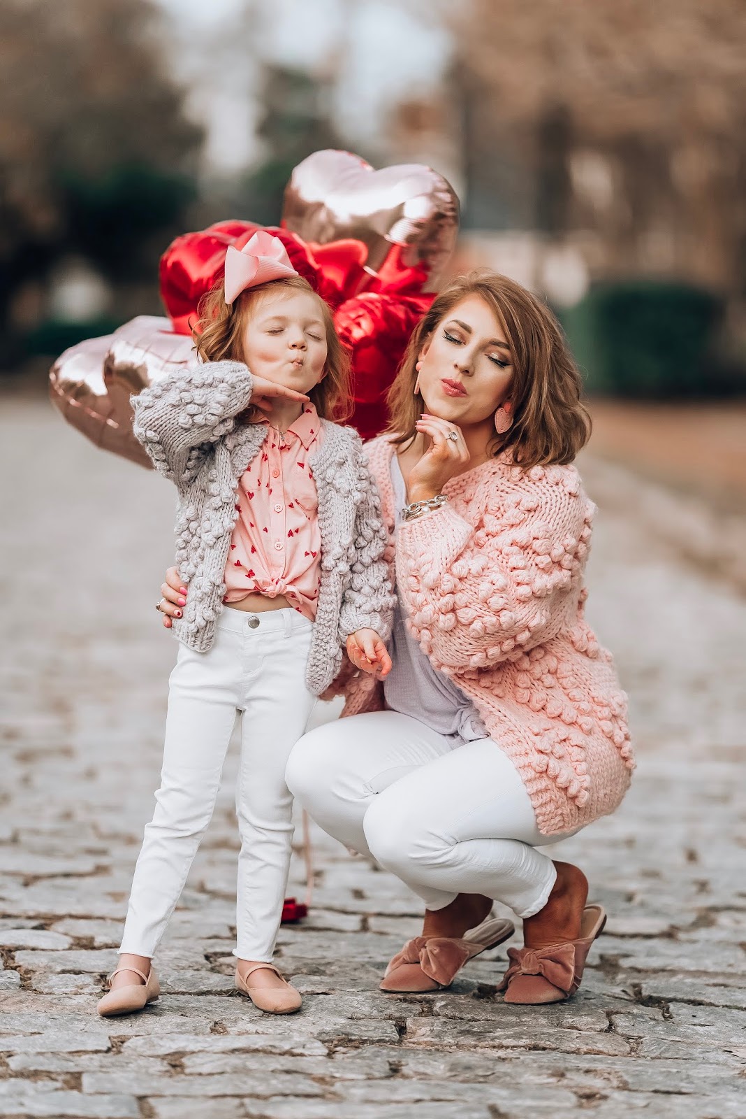 Hello Friends and Happy Valentine’s Day!! Of course on Love Day, we’re wearing our favorite pom pom heart cardigans. Madeline always says reminds me that “hearts mean I love you!” So that is just another reason why I love them so much 🙂 We have these cardigans in four colors, and we are usually matching in them. But this time, I decided to alternate colors with our looks, and I just love the way it turned out! I have the pale pink cardigan with lavender underneath. And Madeline has her lavender cardigan with pink underneath. Speaking of lavender, trust me when I say y’all need this this top! It’s more than amazing and comes in five colors. It’s longer in the front and in the back, and cuts up on the sides. The material is on the thinner side, so you can easily knot it in the front as I have here, or front-tuck it. It’s just the best top ever and a great one to get you into spring.