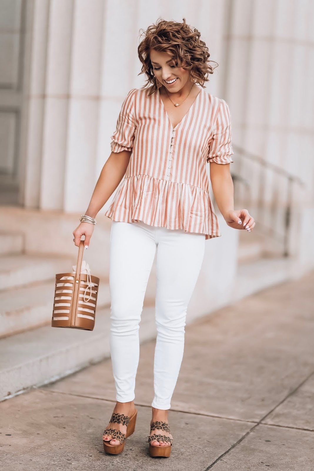 Let’s start off with this top! This striped peplum cutie was a huge hit last year, and I’m so excited that it’s BACK again for this year! Last year, it would hardly stay in stock, but it’s fully stocked in all sizes right now. It definitely runs TTS (wearing the XS, for reference). I love it with both a dark wash jean and white jeans. It also looks SO cute with shorts for summer. Trust me when I say you need it in your closet 🙂 I decided to do a little bit of print mixing as well, and pair it with these amazing leopard print scallop sandals. They come in three colors (I also have them in yellow). They do run a bit large are stretch with wear, be sure to size down one size. The last thing to mention here is this bucket bag! Y’all it’s just about the cutest thing!! Oh and it’s under $50! It also comes with a longer strap so you can wear it cross body. I just love it.