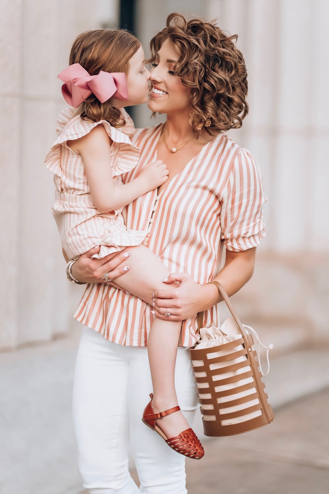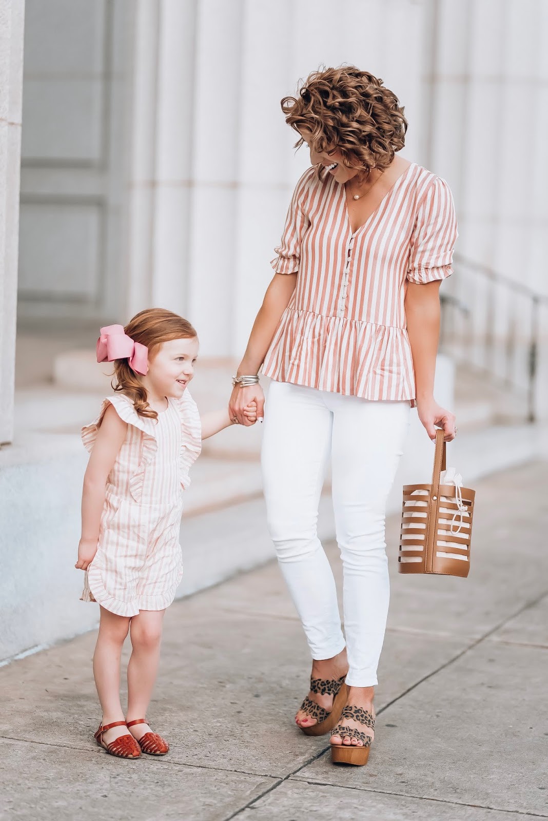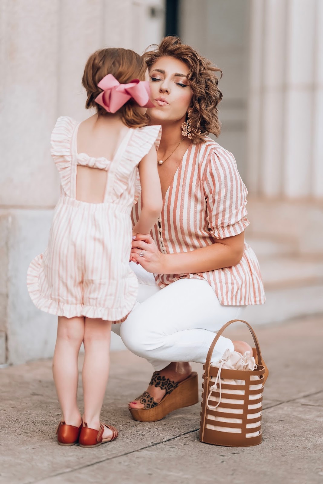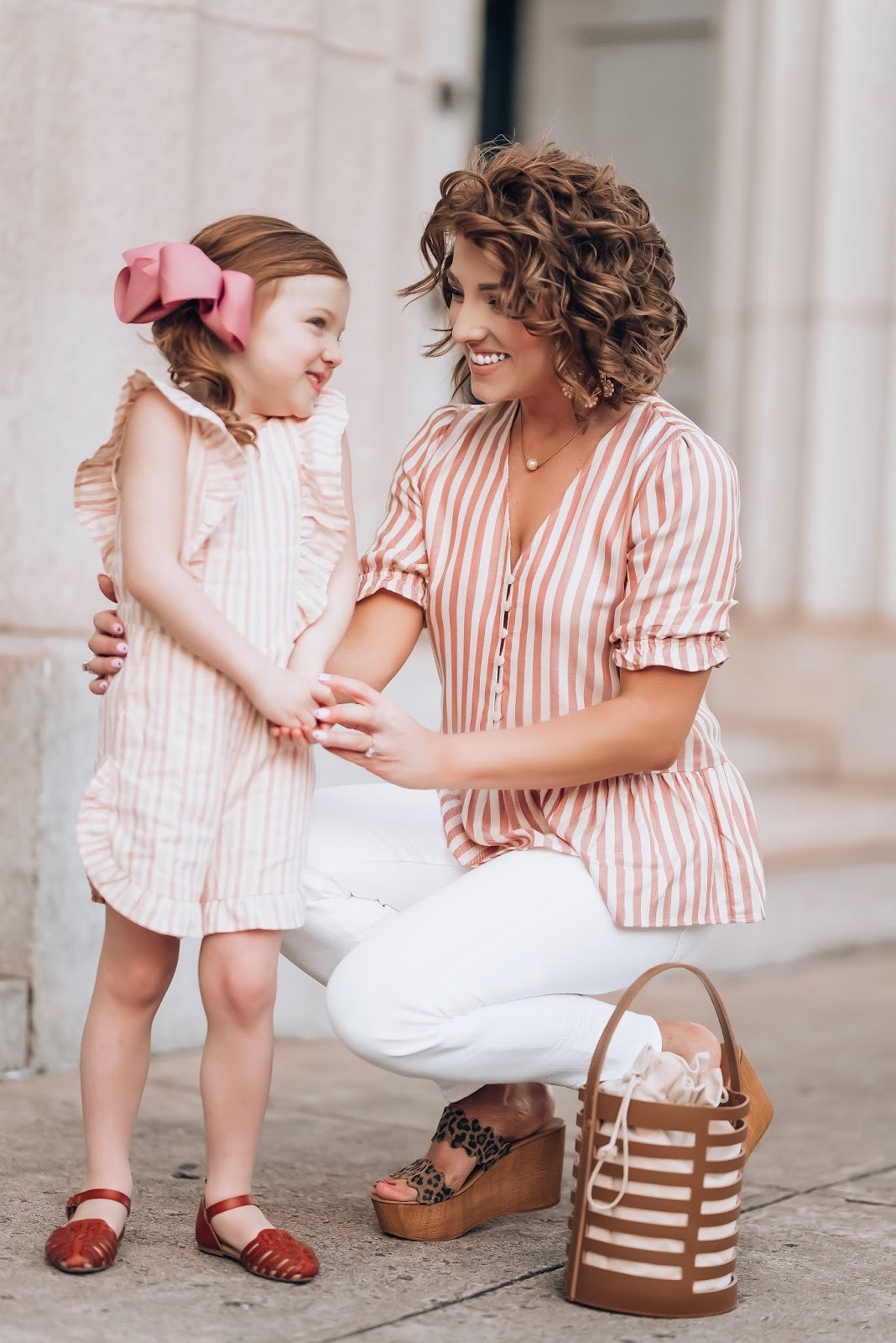 Now for s little on Madeline’s look. I just about died when I found this strip, bow-back romper with ruffle details. It’s the cutest thing! It is also such a fun pairing with my top for the perfect mommy and me coordinating look. I’m also so excited, because her brown sandals are back again for this year! They were a favorite of mine last year, and this year they’re back and even better!